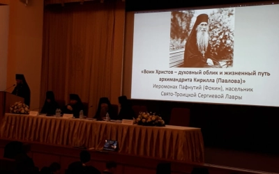 Иеромонах Пафнутий (Фокин), насельник Троице-Сергиевой Лавры представил доклад «Воин Христов» - духовный облик и жизненный путь архимандрита Кирилла (Павлова)». Докладчик отметил, что рядом с отцом Кириллом подвизались и другие участники войны, среди которых он назвал и схиархимандрита Михаила (Балаева), «по благословению которого была написана икона «Одигитрия Вяземская-ратная».