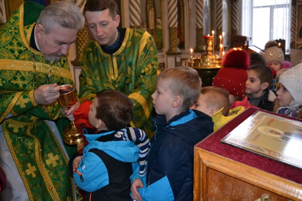 Малыши внимательно следили за службой, приступили к Таинству Евхаристии, а после причастия получили богослужебные хлеба – просфоры. Педагоги детского сада стараются ежемесячно привозить детей в храм. Помимо этого, настоятель храма Рождества Христова прот. Сергий Зеленков постоянно навещает ребят, участвуя в праздниках детского сада, совершая краткие молебны в молитвенной комнате и проводя небольшие беседы с малышами.