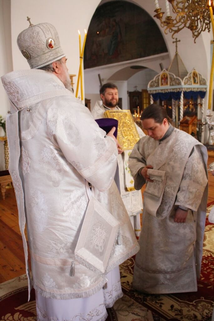 На Малом входе Владыка Сергий вручил Патриаршую награду священнодиакону Свято-Троицкого кафедрального собора Евгению Ткачу – право ношения камилавки.