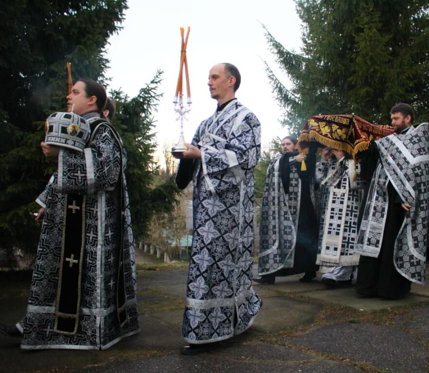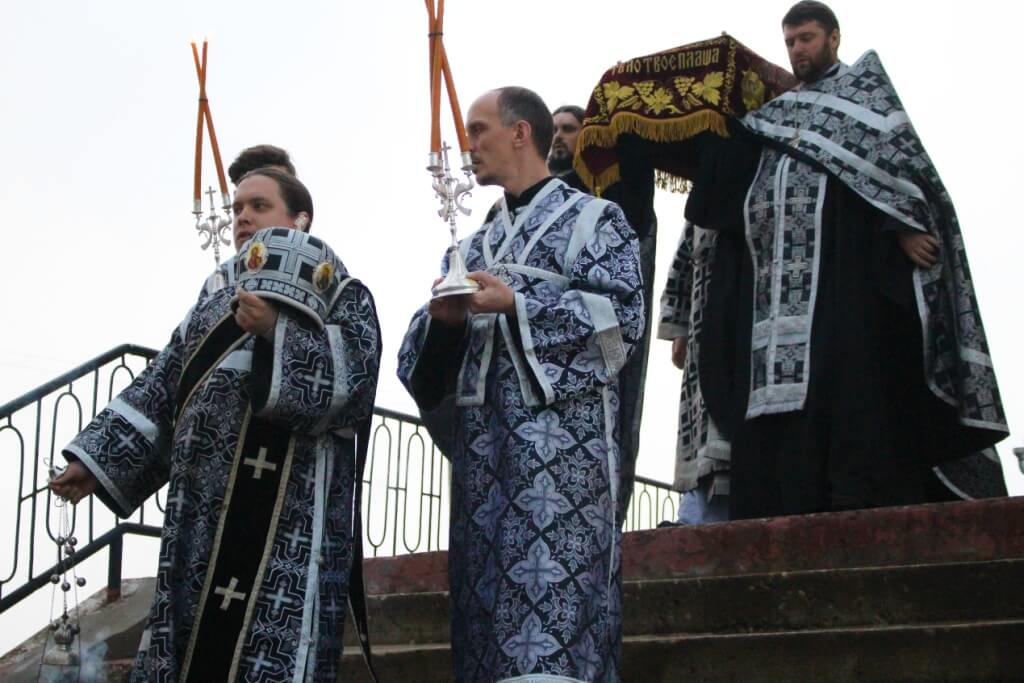 После стихир, с началом великого славословия, Правящий Архиерей совершил каждение вокруг Плащаницы. Затем, повторяя «Трисвятую песнь» Владыка в сопровождении священников собора совершили Крестный ход с Плащаницей вокруг храма — чин погребения Спасителя.