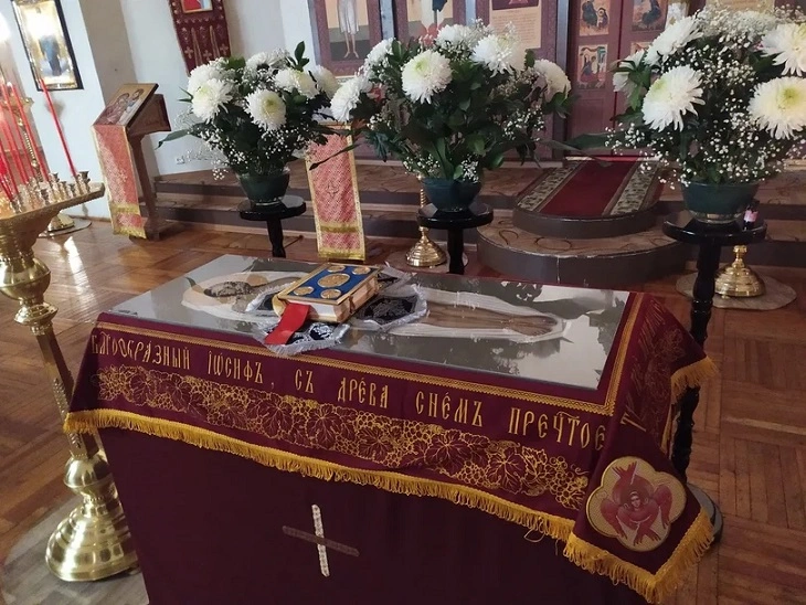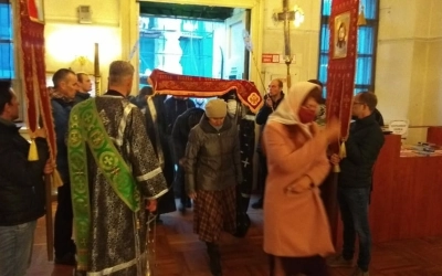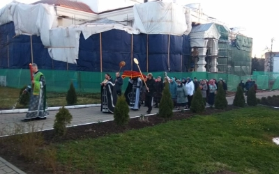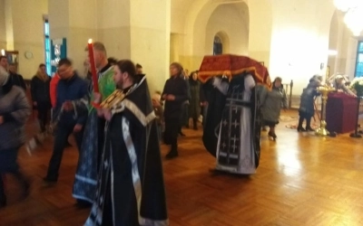 По окончанию, духовенство и прихожане совершили крестный ход с плащаницей вокруг Тихвинского храма.