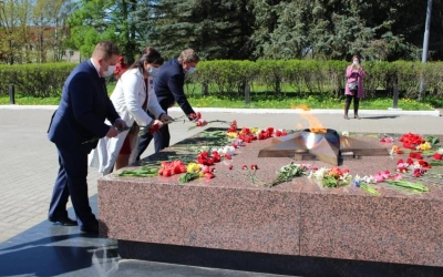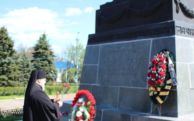 В продолжении торжественного митинга к Мемориалу "Вечный огонь" и памятнику Генералу Ефремову Михаилу Григорьевичу- Власти города, Епископ Сергий с духовенством возложили корзины и букеты с живыми цветами.