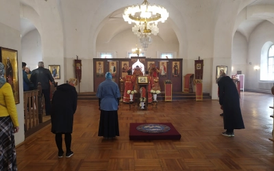 9 мая 2020 года, в день поминовения усопших воинов - День Победы, благочинный Гагаринского округа игумен Александр (Карпиков) совершил Божественную литургию в Тихвинском храме Архиерейского подворья Благовещенского собора г.Гагарин.