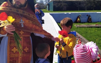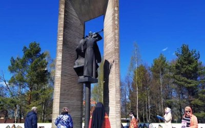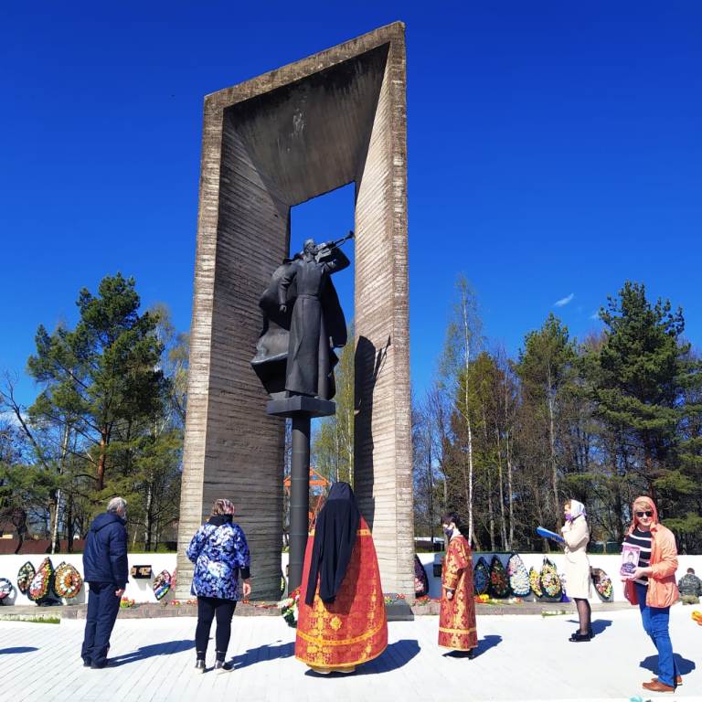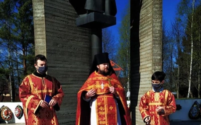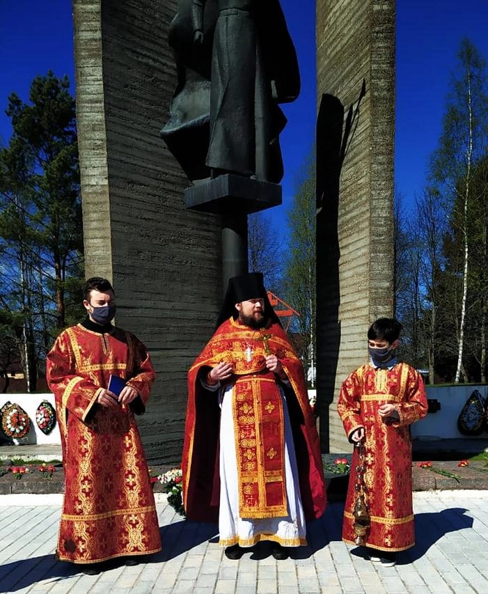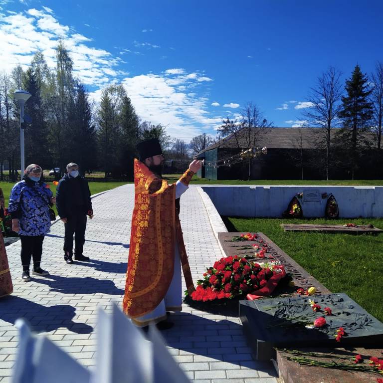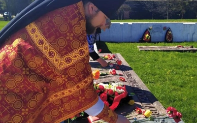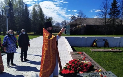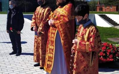 По завершении Литургии отец Андрей, с верующими, совершил заупокойную литию на Воинском мемориале и возложил цветы.