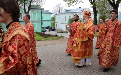 По отпусте Литургии Епископ Вяземский и Гагаринский Сергий возглавил Пасхальный Крестный ход вокруг храма, после чего было совершено славление святым равноапостольным Кириллу и Мефодию, и возглашено многолетие тезоименитому Патриарху Московскому и всея Руси Кириллу.