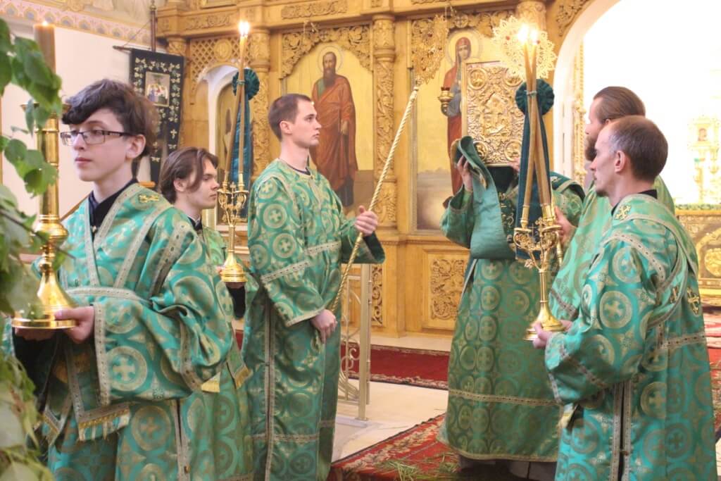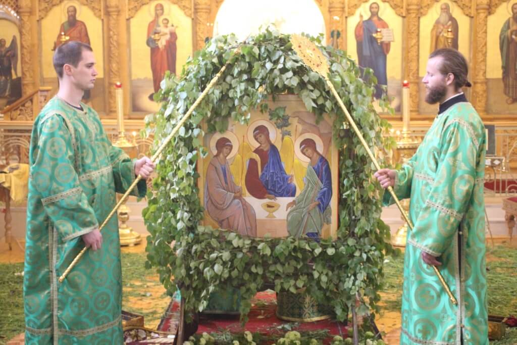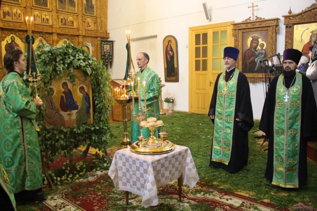 На Троицу в православных храмах совершается одна из самых красивых служб в году. Церкви полны летней зелени: люди приносят полевые травы, ветки березы, цветы. Пол храма устлан свежескошенной травой, запах ее мешается с ароматом ладана. Цвет облачений священнослужителей — зеленый.