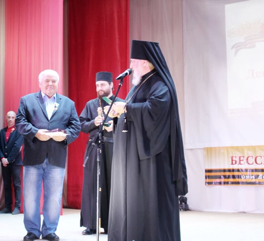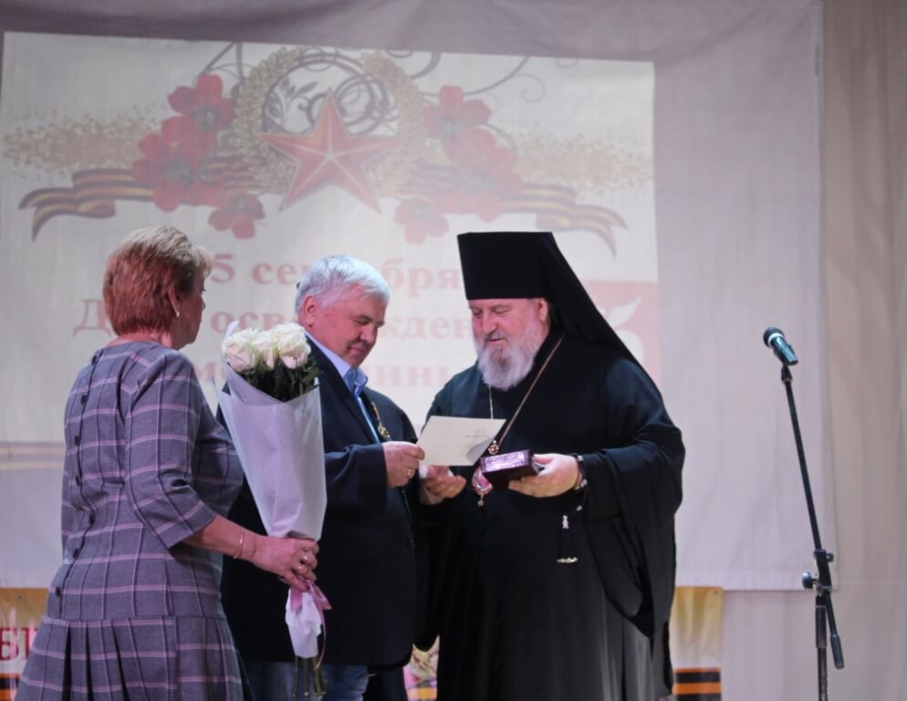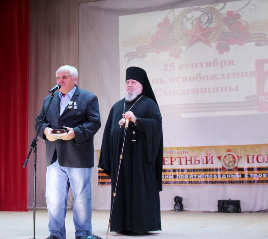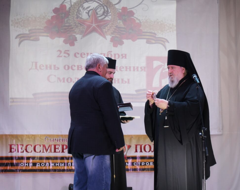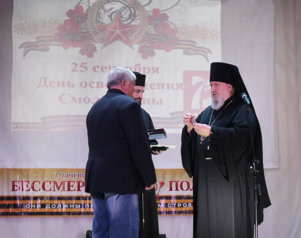 В продолжении своего обращения Епископ Сергий выполнил поручение Святейшего Патриарха Кирилла, наградив Патриаршей медалью прп. Серафима Саровского, бывшего Главу Администрации МО Сычёвский район Евгения Тимофеевича Орлова.