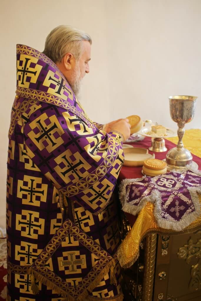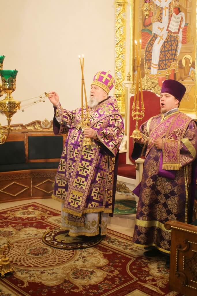 По отпусте Литургии Архипастырь и сослужившее Его Преосвященству духовенство совершили славление, и поклонились Кресту Господню.