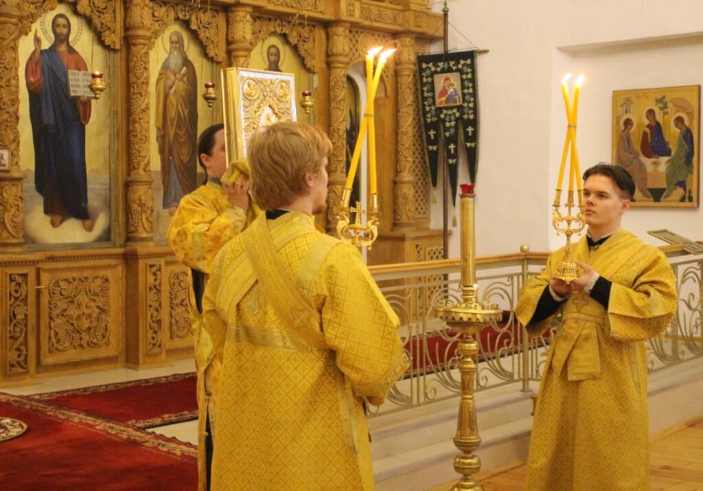 настоятель Свято-Троицкого кафедрального собора города Вязьма иерей Александр Курмелёв, клирик Свято-Троицкого кафедрального собора города Вязьма иерей Владимир Покатов, клирик Свято-Троицкого кафедрального собора города Вязьма иеромонах Симеон (Берёзкин).