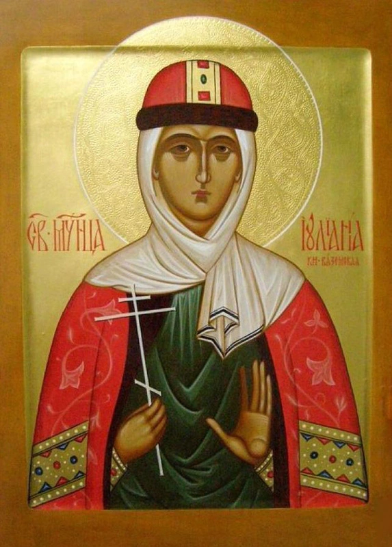 В Словаре историческом о русских святых, изданном в 1862 г. в Санкт-Петербурге: «Иулиания, княгиня Вяземская, супруга Симеона Мстиславича, удельнаго князя Вяземскаго. – Сей князь как другъ и вассалъ князя Смоленскаго Юрия Святославича, лишеннаго своихъ владений разделялъ съ нимъ бедственное изнание въ Торжке, вместе с прекрасною супругою своею Иулианиею. Равно жестокий и сластолюбивый, Юрий пылалъ вожделениемъ осквернить ложе Симеоново; не успевъ въ томъ ни соблазномъ, ни коварными хитростями, дерзнулъ на явное злодеяние: в своемъ доме , среди веселаго пира, убилъ князя Вяземскаго, и думалъ воспользоваться ужасомъ несчастной супруги. – Любя непорочность более всего в мире, она искала спасения въ бегстве. Юрий, обнаживъ мечъ, догналъ Иулианию на дворе, изрубилъ ее и велелъ бросить въ реку. Это гнусное убийство случилось (следуя Троицкому летописцу) 1407 года. Тело добродетельной княгини погребено въ соборной церкви Преображения, въ городе Торжке, где и ныне мощи ея почиваютъ подъ спудомъ».