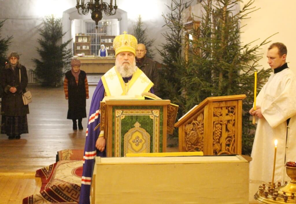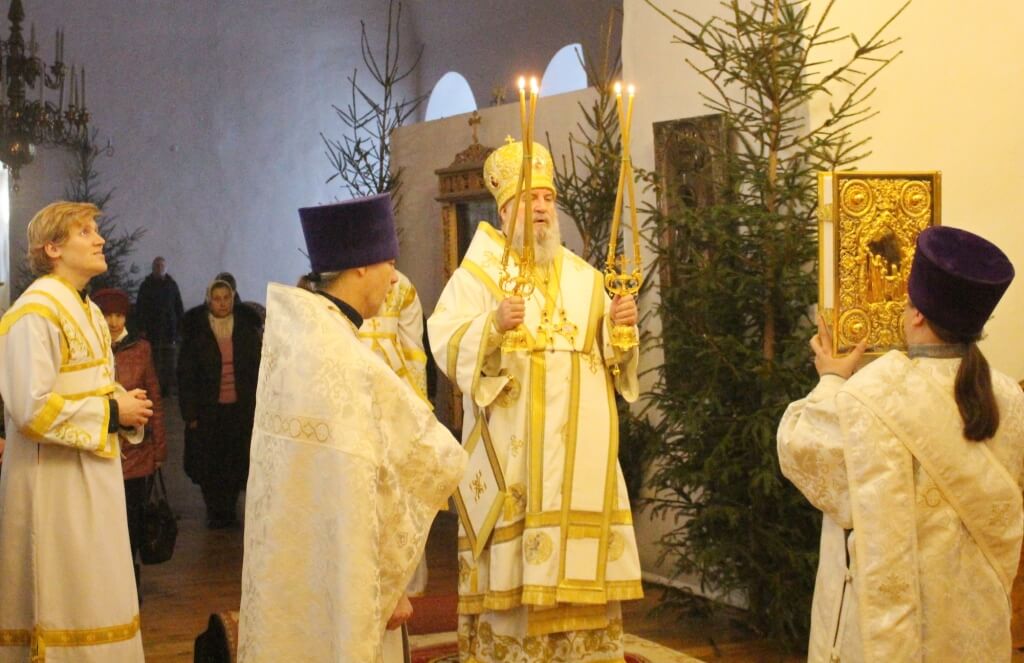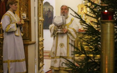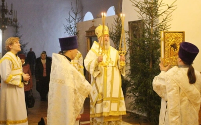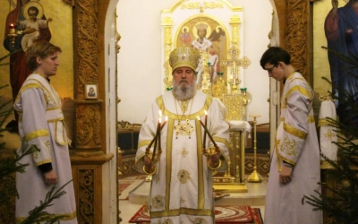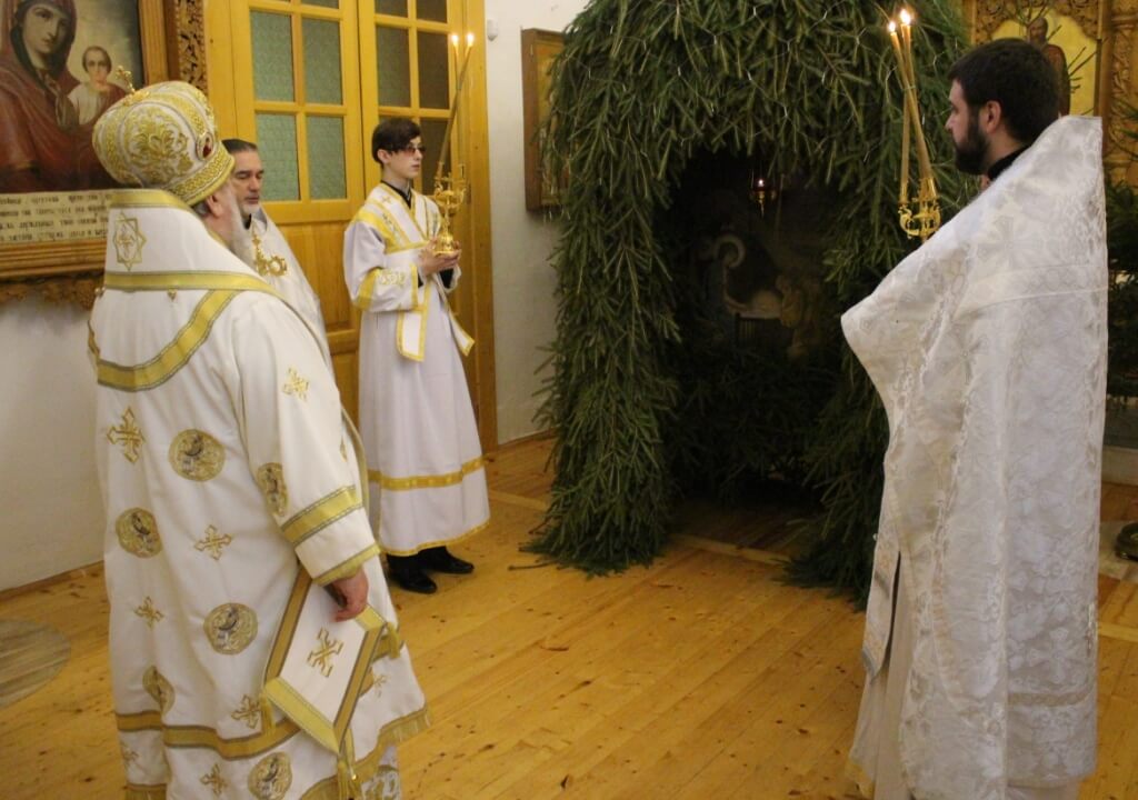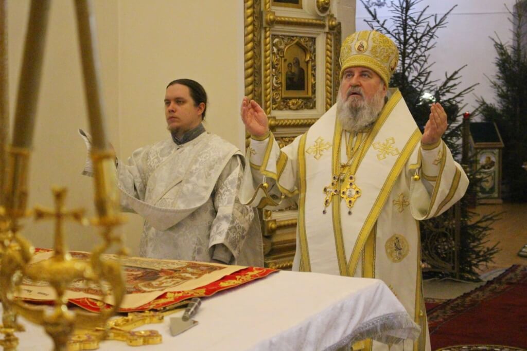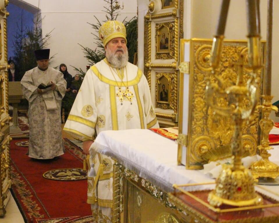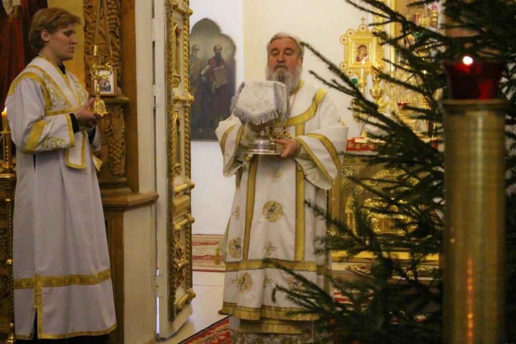 Уставные богослужения Рождественского сочельника возглавил епископ Вяземский и Гагаринский Сергий в сослужении духовенства Свято-Троицкого собора.