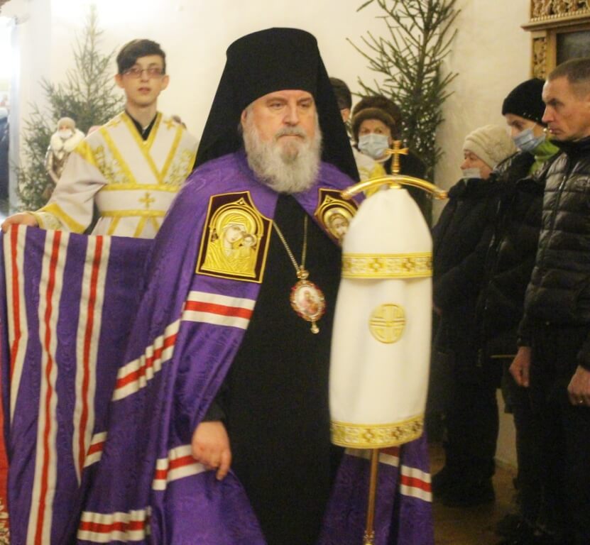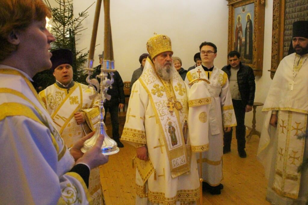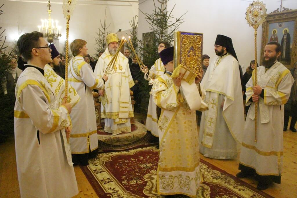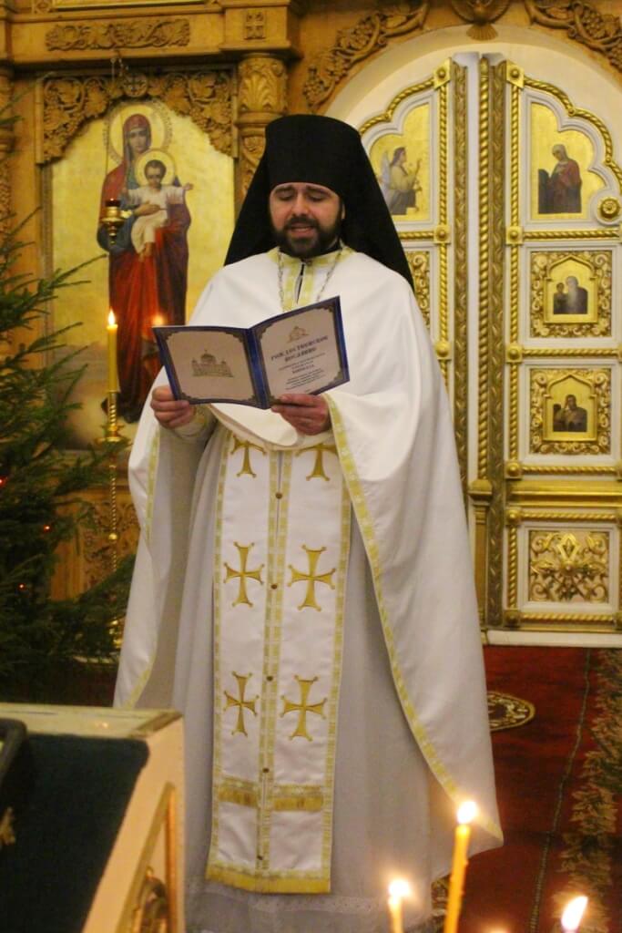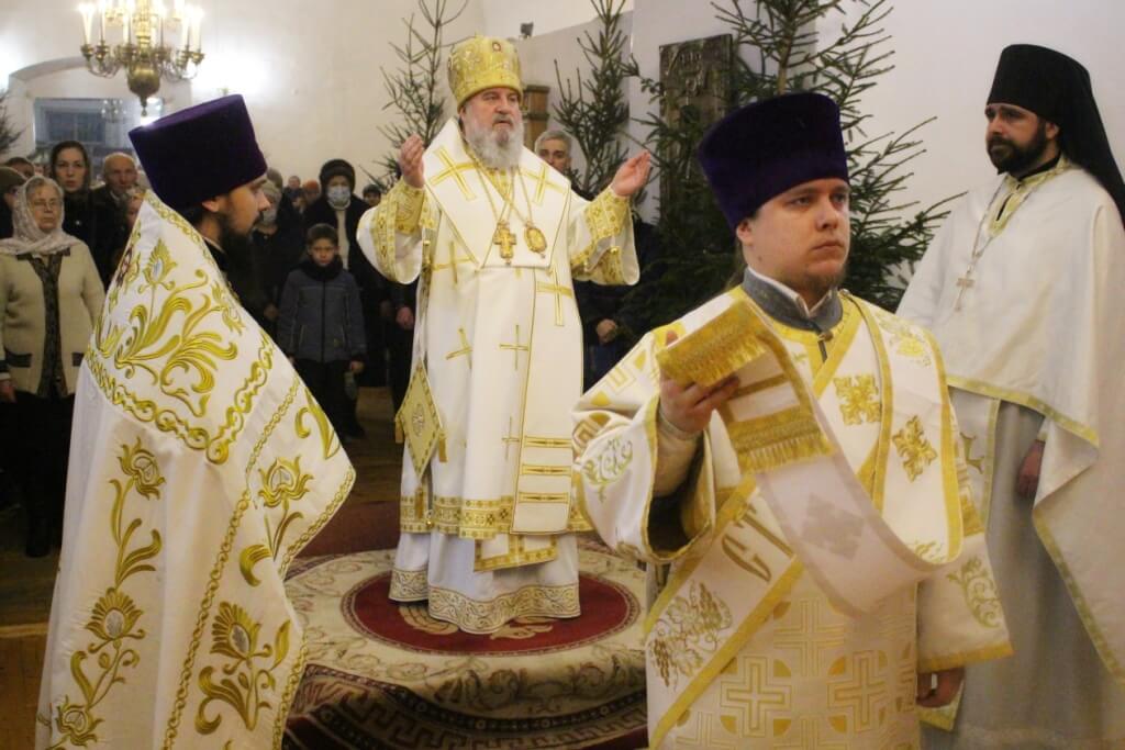 На запричастном стихе клирик Свято-Троицкого кафедрального собора города Вязьма иеромонах Симеон (Берёзкин) огласил Рождественское послание клиру, монашествующим и мирянам Святейшего Патриарха Московского и всея Руси Кирилла.