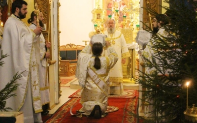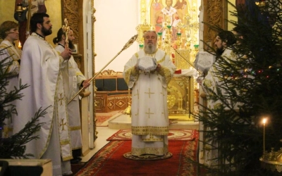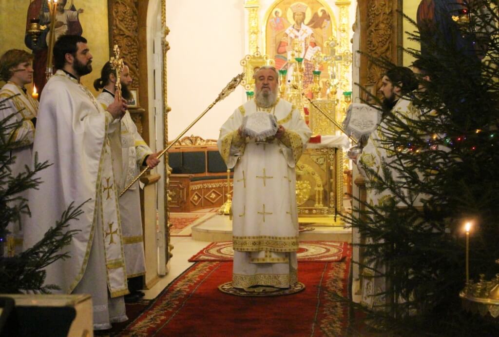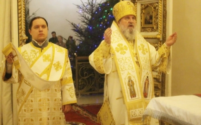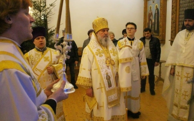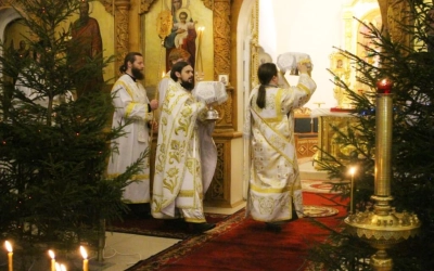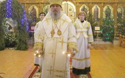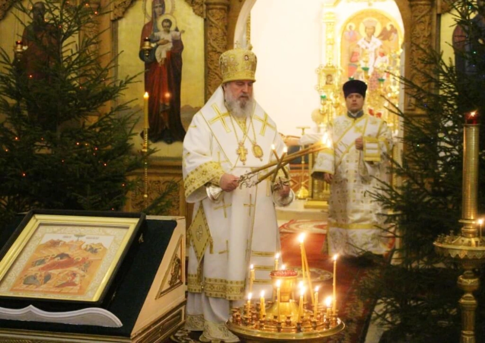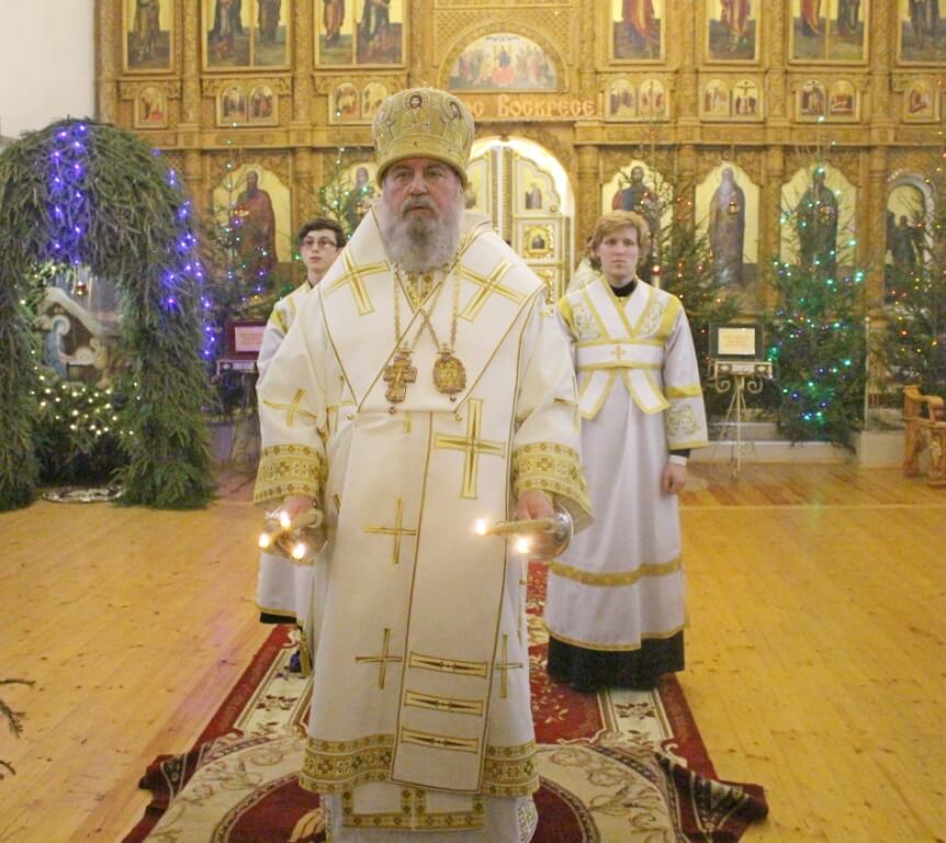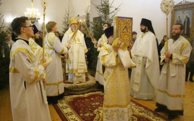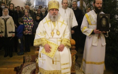 На запричастном стихе клирик Свято-Троицкого кафедрального собора города Вязьма иеромонах Симеон (Берёзкин) огласил Рождественское послание клиру, монашествующим и мирянам Святейшего Патриарха Московского и всея Руси Кирилла.