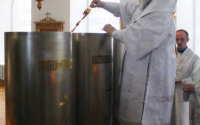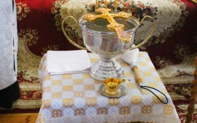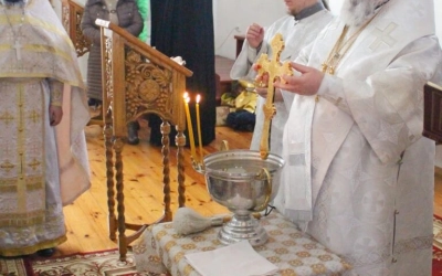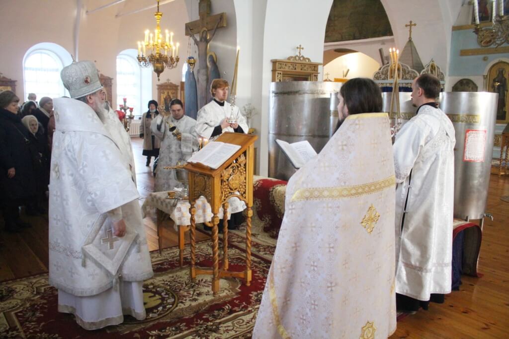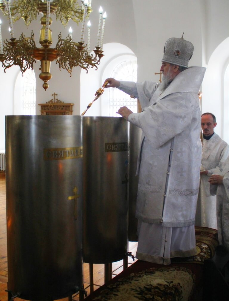 По завершении чина Великого освящения воды, епископ Сергий окропил великой агиасмой (богоявленской святой водой) храм и молящихся.
