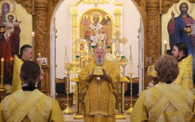 За богослужением возносились сугубые молитвы о здравии и долгоденствии Святейшего Патриарха Кирилла.