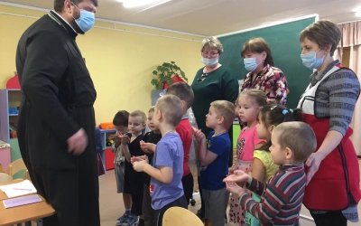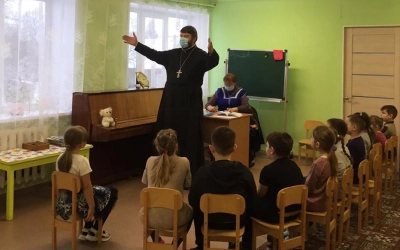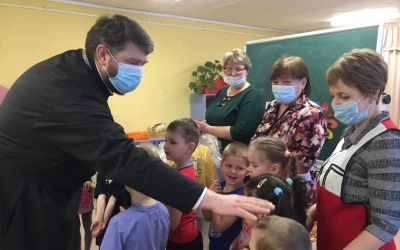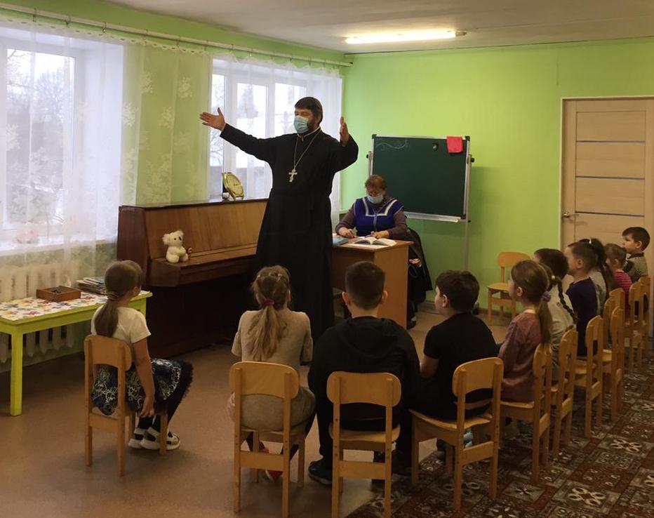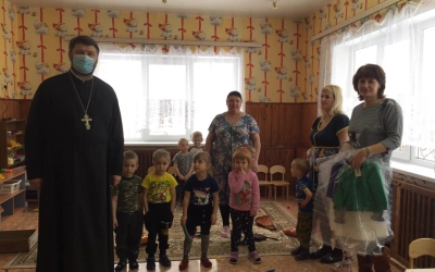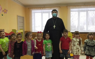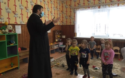 В рамках духовно-нравственного просвещения жителей Сычёвского района настоятель храма Иверской иконы Божией Матери д. Устье иерей Алексей провёл встречи с воспитанниками четырёх детских садов Сычёвского района.