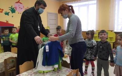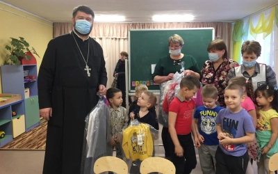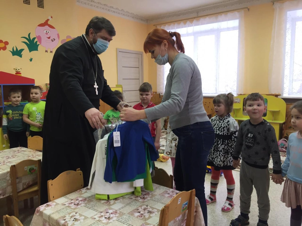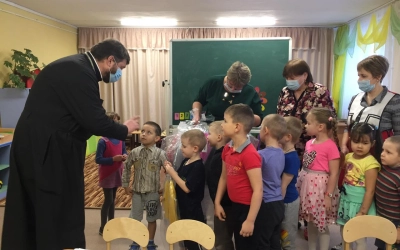 Совместно с сотрудниками гуманитарного склада Иверского прихода иерей Алексий несет радустную весть заведующим, воспитателям и конечно же воспитанникам детских садов!