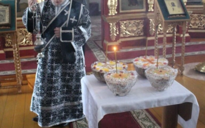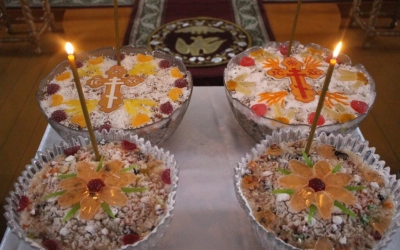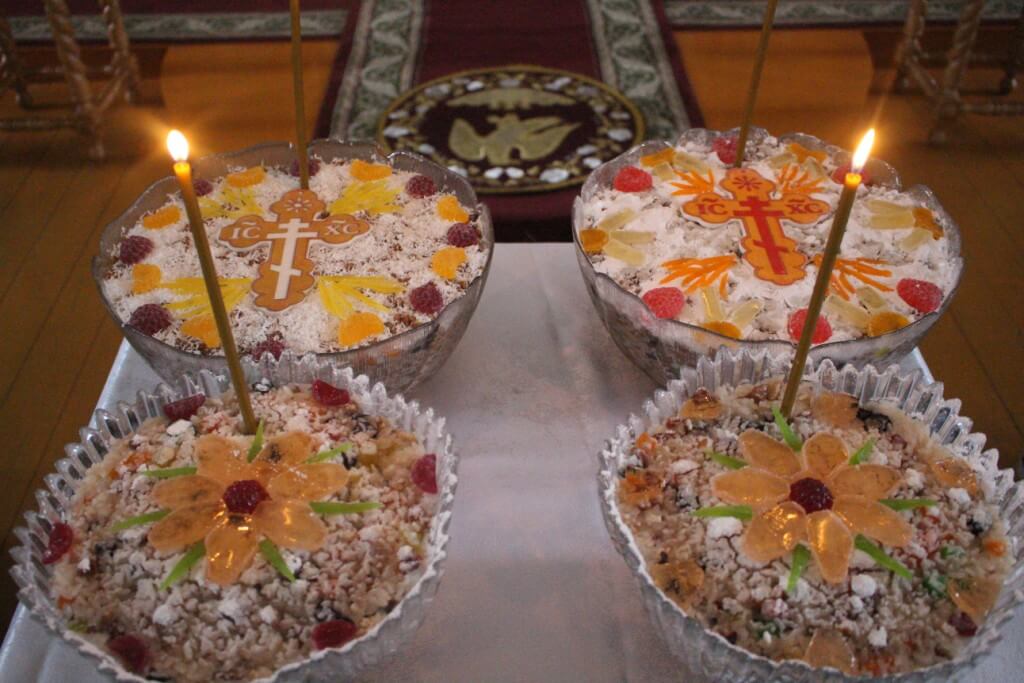 Архипастырь совершил молитву на благословение колива и окропил его святой водой.
