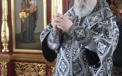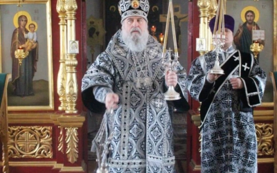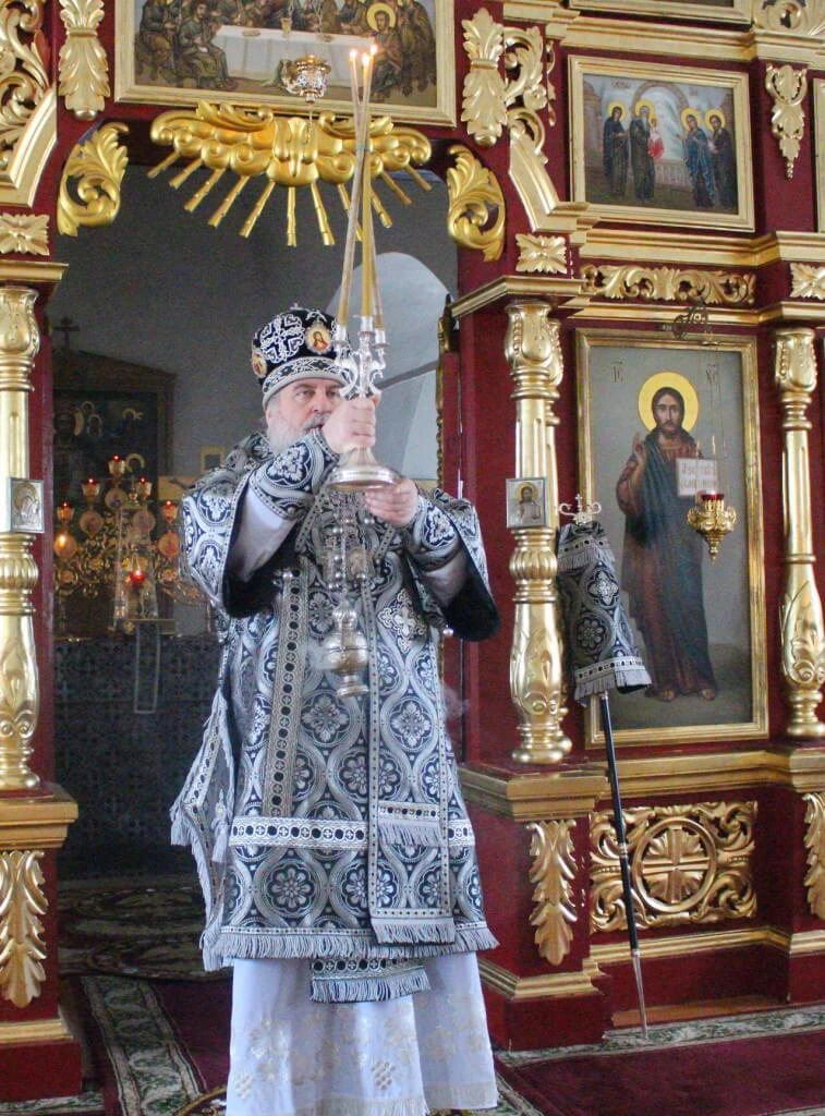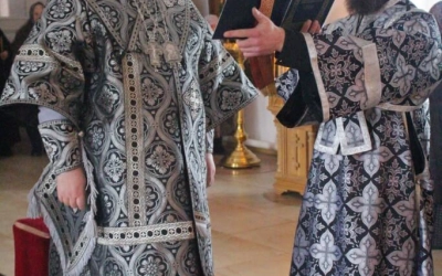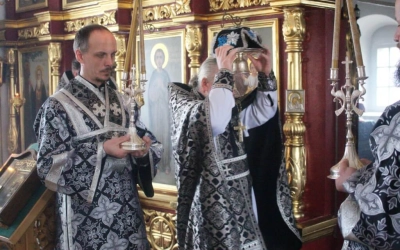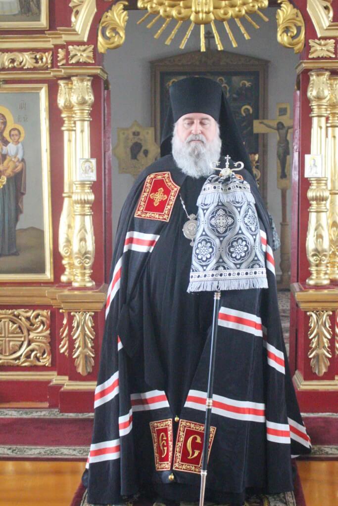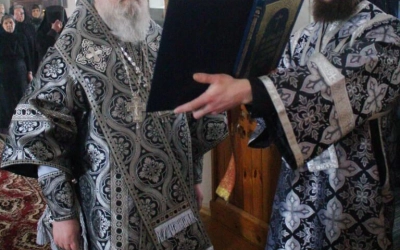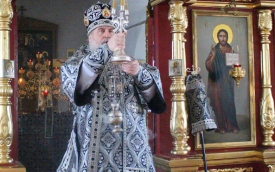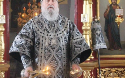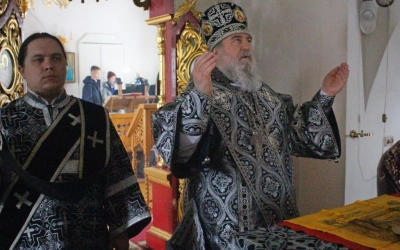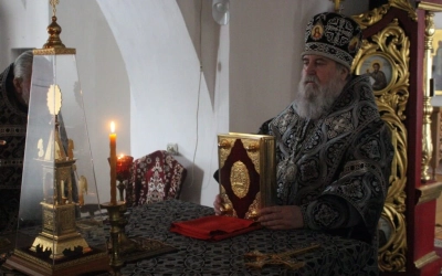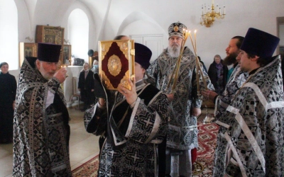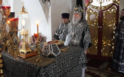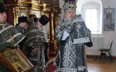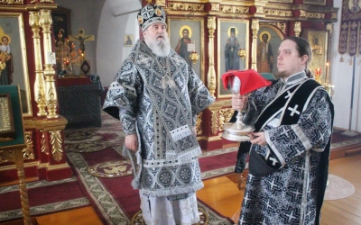 По заамвонной молитве было совершено последование, ежегодно совершаемое в пяток первой великопостной седмицы. После пения тропаря и кондака св. вмч. Феодору Тирону епископ Сергий с духовенством совершили молебный канон великомученику Феодору Тирону.