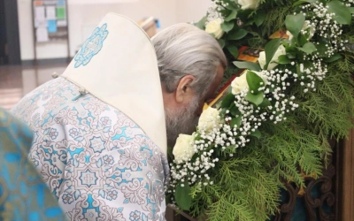 В продолжении праздничного богослужения были совершены славление Пресвятой Богородице и поклонение Кресту Господню.