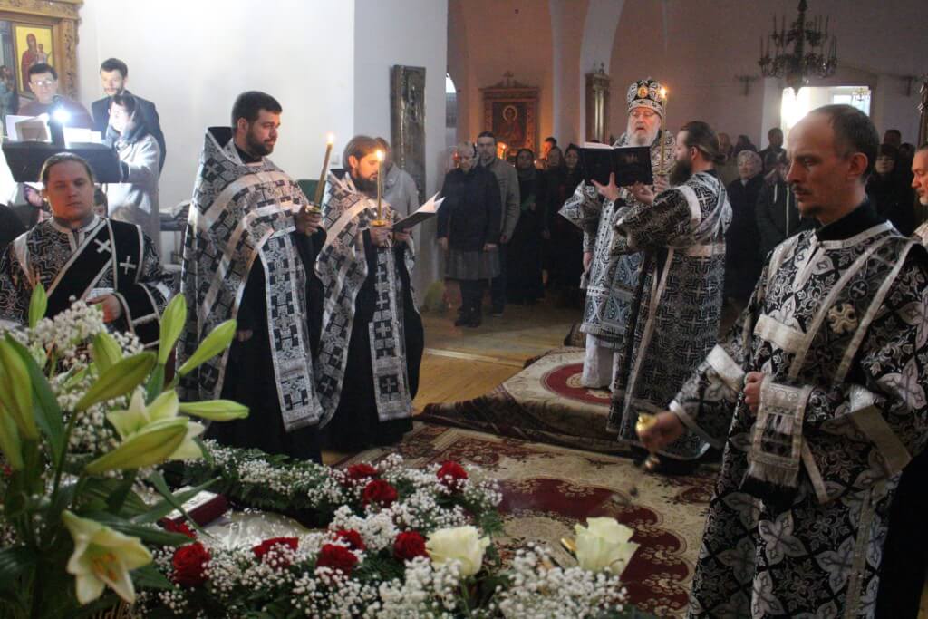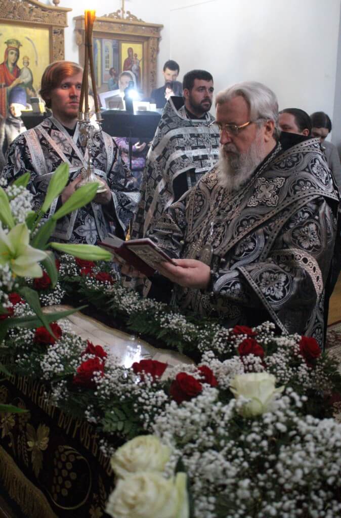 Вечером в этот же день, накануне Великой Субботы Епископ Сергий совершил утреню с чином погребения Плащаницы.