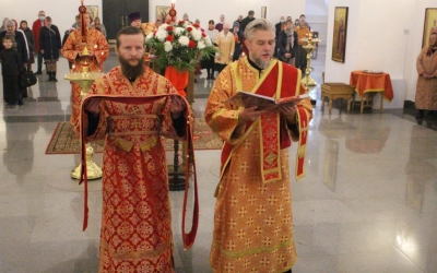 настоятель Благовещенского собора Архиерейского подворья города Гагарин игумен Александр (Карпиков), клирик Благовещенского собора Архиерейского подворья города Гагарин иерей Роман Ступа.