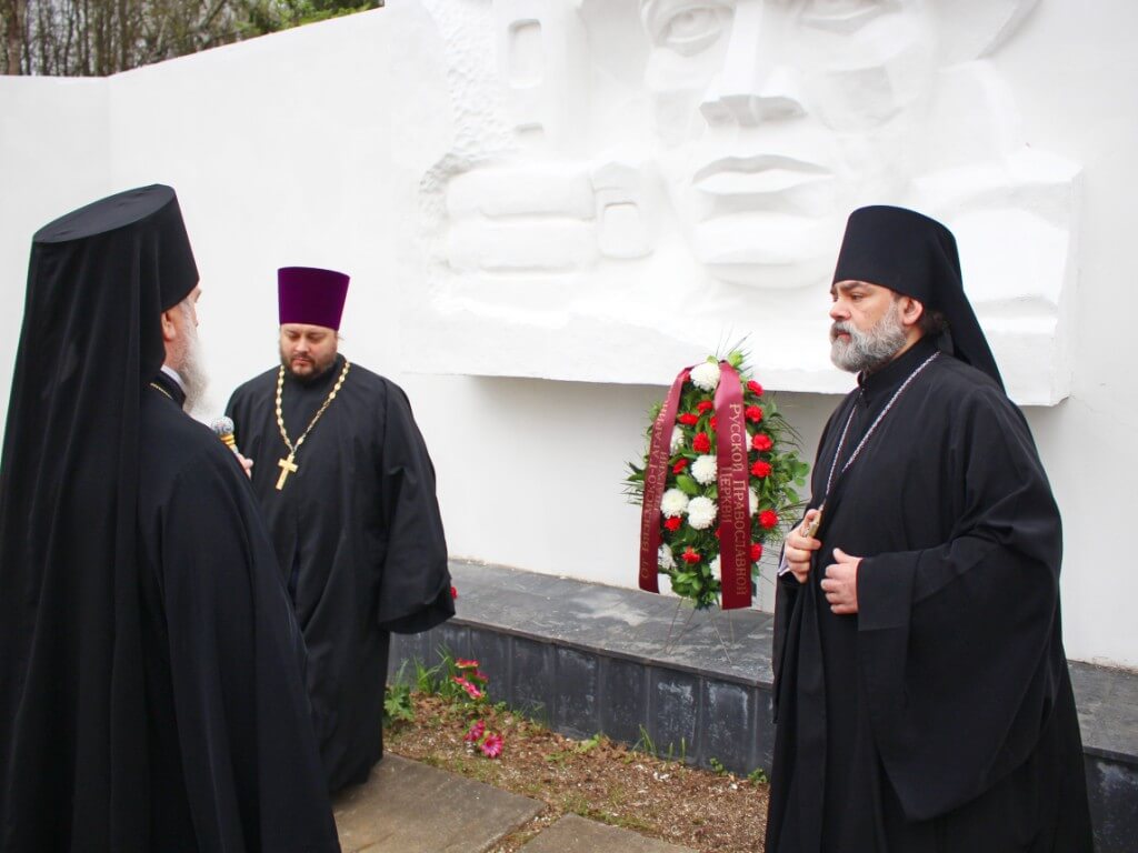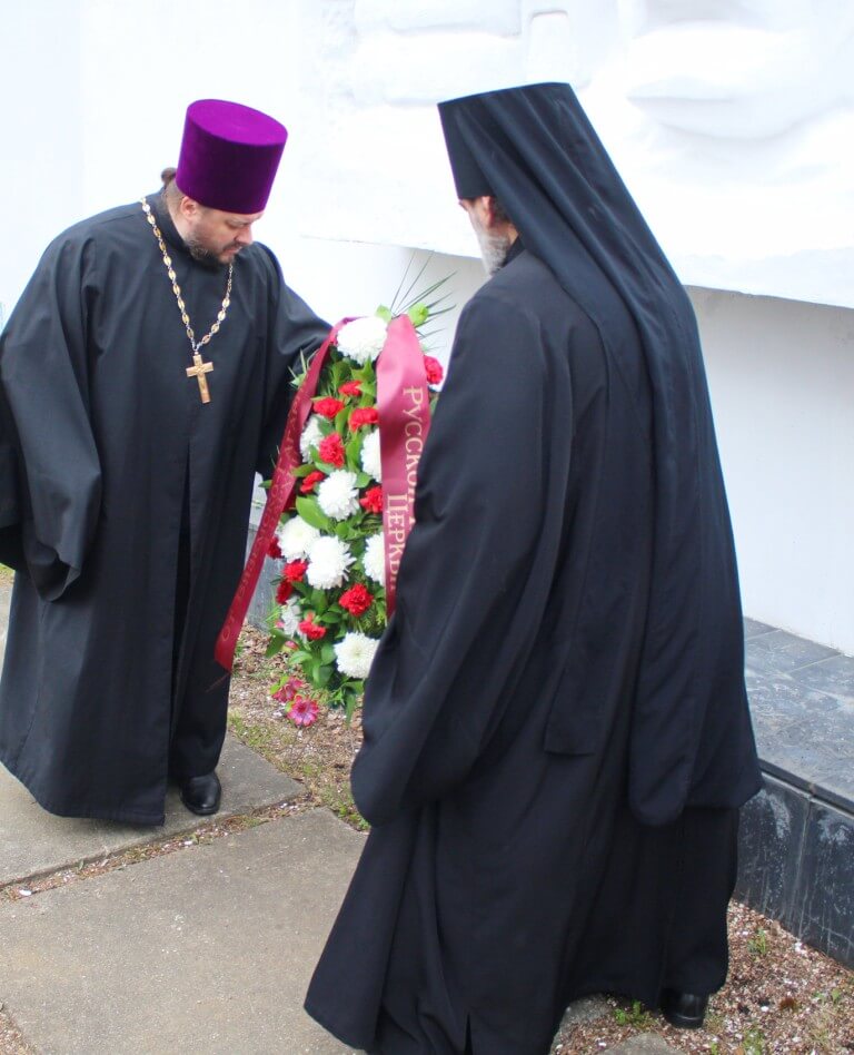 Накануне Дня Великой Победы Глава Вяземской епархии возложил венок к Воинскому Мемориалу "Братское захоронение" города Гагарин, и почтил память павших в Великой Отечественной войне минутой молчания.