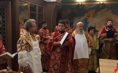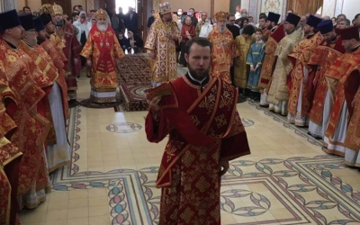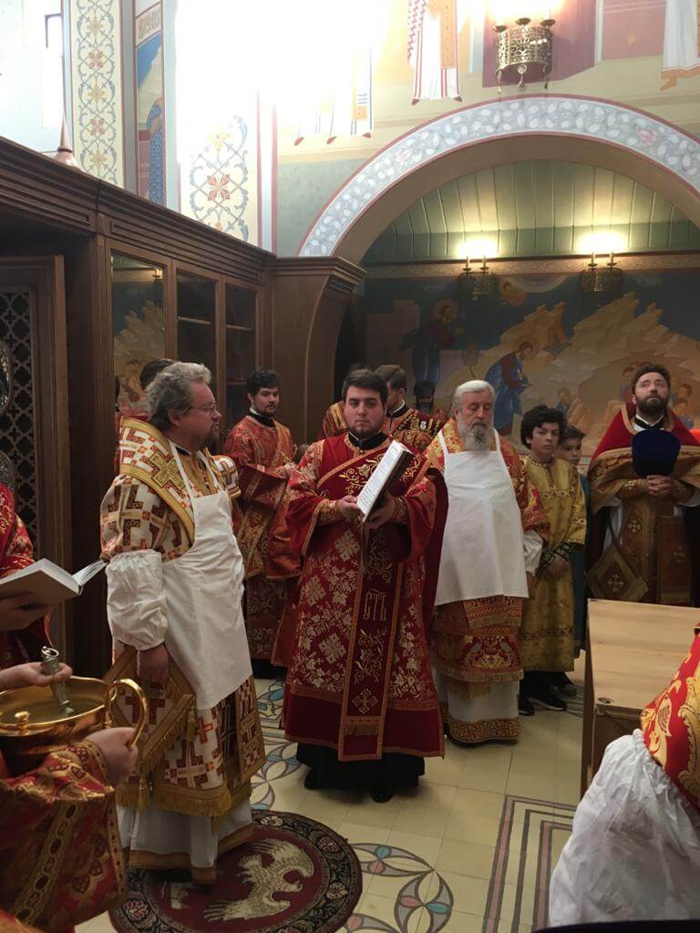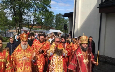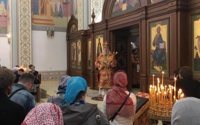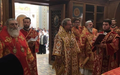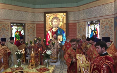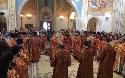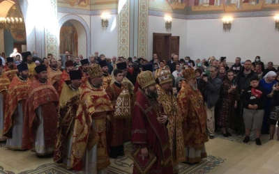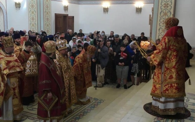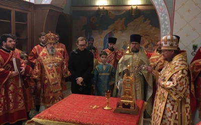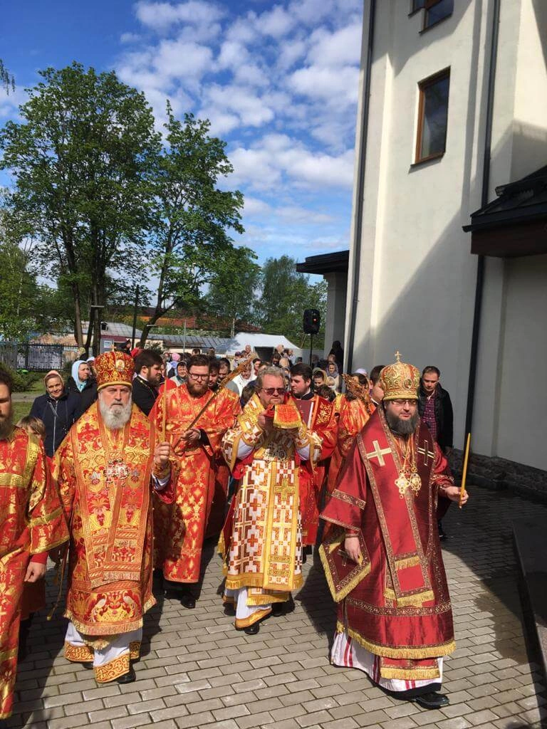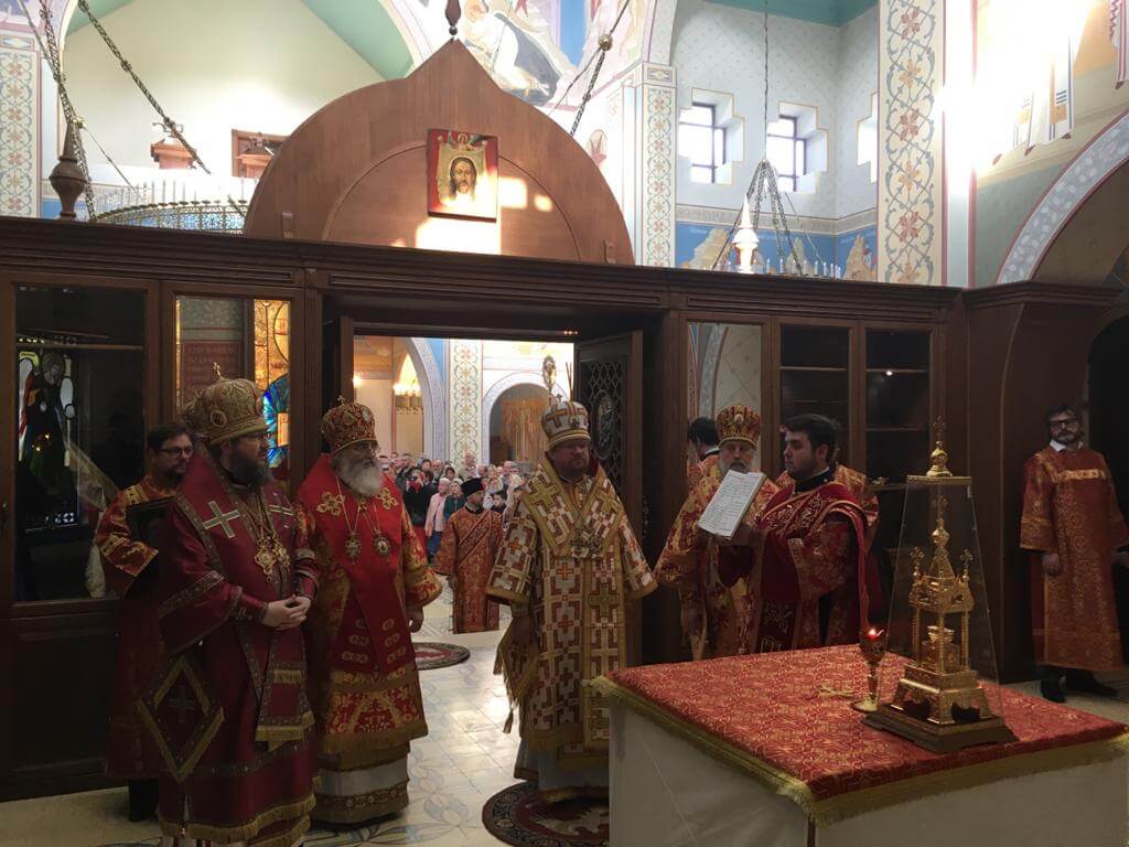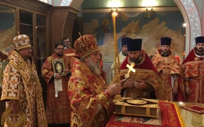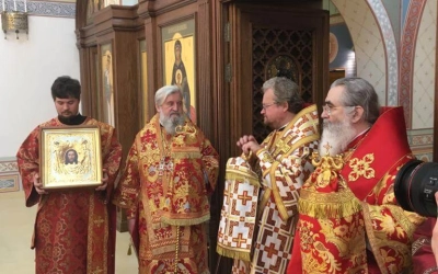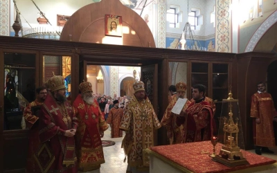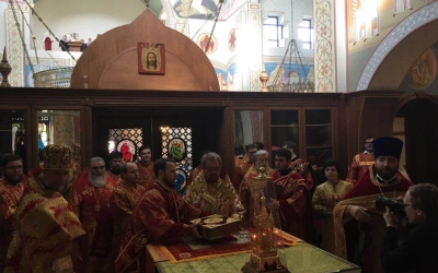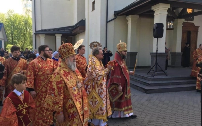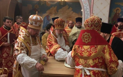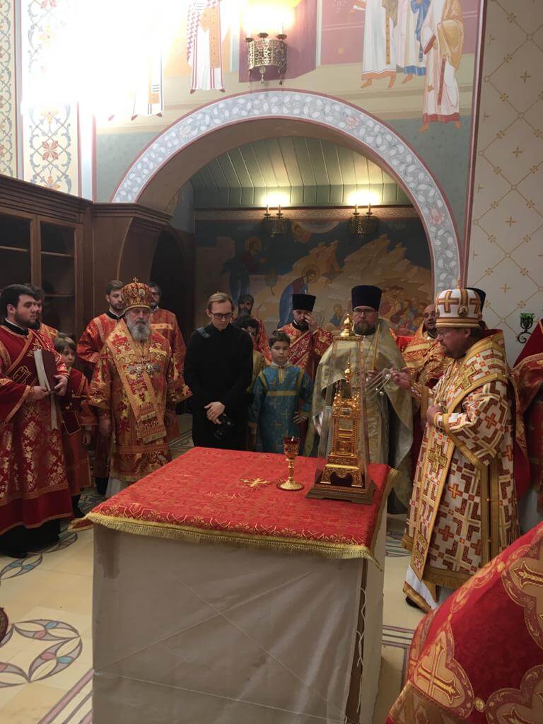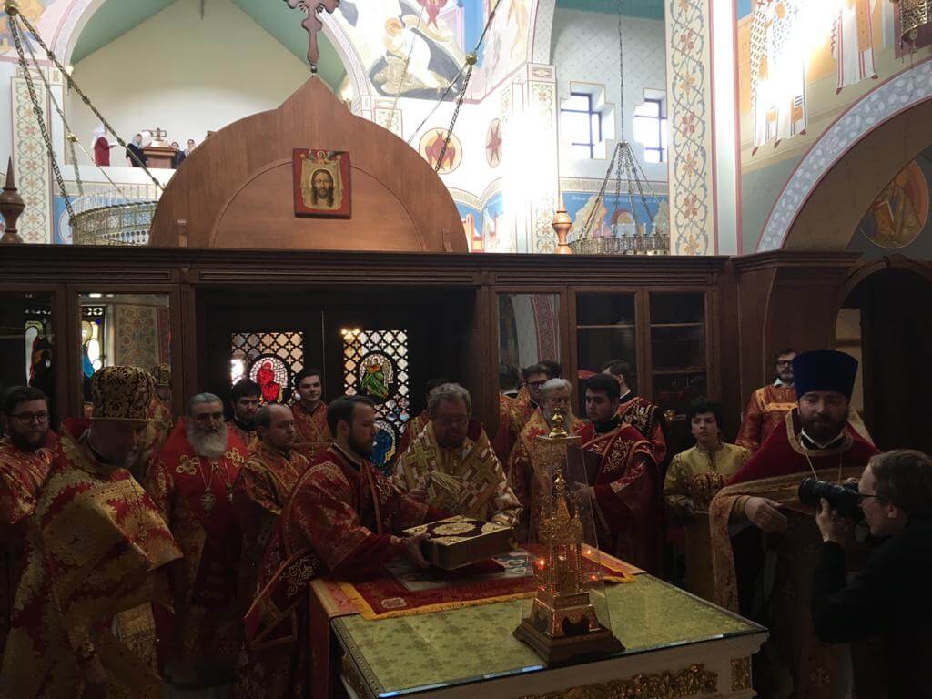 Архипастыри совершили крестный ход вокруг храма с мощами преподобномученика Фомы Зографского, которые затем были положены в основание церковного престола.