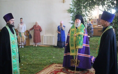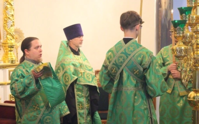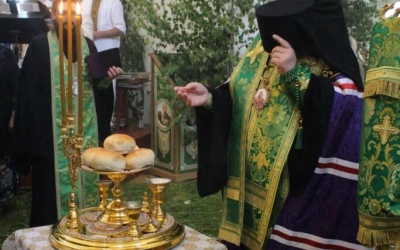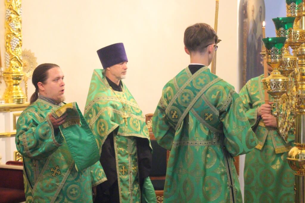 За богослужением были прочитаны три паремии (ветхозаветных пророчества) о ниспослании Святого Духа, совершены лития и освящение пяти хлебов, пшеницы, вина и елея.