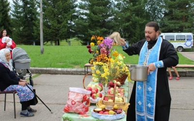 Далее отец Роман освятил принесенные местными жителями плоды: яблоки, груши, виноград и овощи.