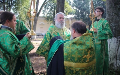 Правящему Архиерею сослужили: секретарь епархиального управления Вяземской епархии протоиерей Олег Переверзев, благочинный церквей Вяземского округа протоиерей Валерий Калинин, настоятель возрождаемого храма иеромонах Евфимий (Бакакин), духовенство Вяземского благочиния.