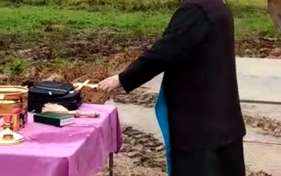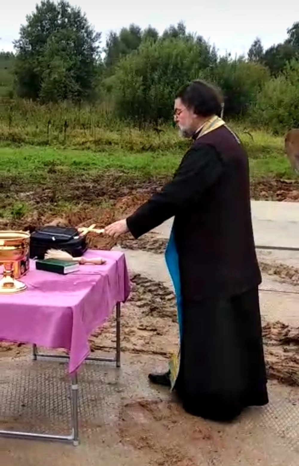 Для благословения начала стройтельства на место прибыл благочинный церквей Гагаринского округа игумен Александров (Карпиков).