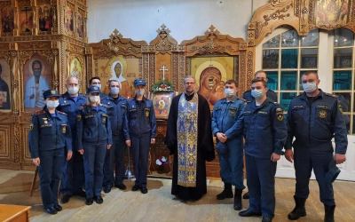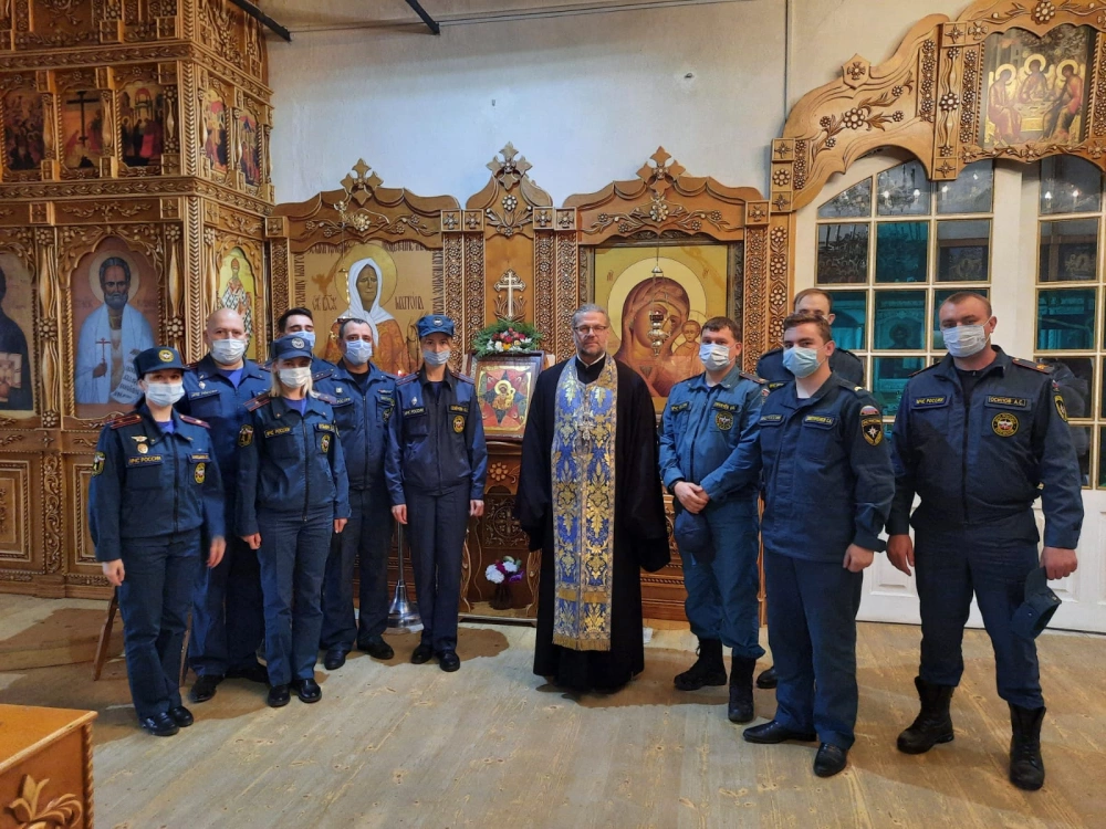 На молебне присутствовал личный состав ОНДПР Вяземского ,Тёмкинского и Угранского р-нов УНДПР ГУ МЧС России по Смоленской области. Протоиерей Валерий поздравил всех с престольным праздником и особенно сотрудников МЧС на которых призвал Божие благословение.