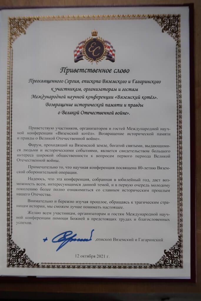 Приветственное слово Преосвященного Сергия, епископа Вяземского и Гагаринского к участникам, организаторам и гостям Международной научной конференции «Вяземский котёл». Возвращение исторической памяти и правды о Великой Отечественной войне».
