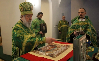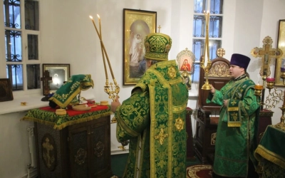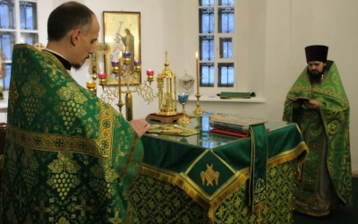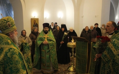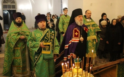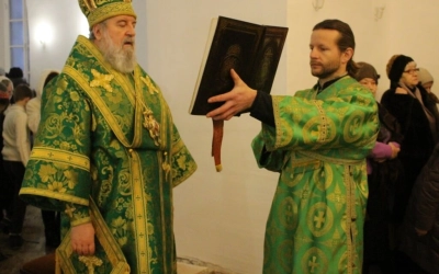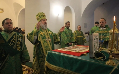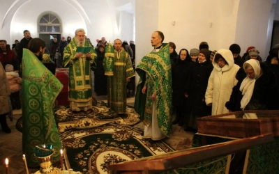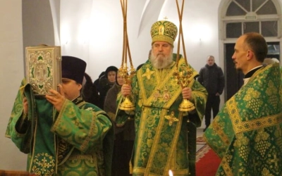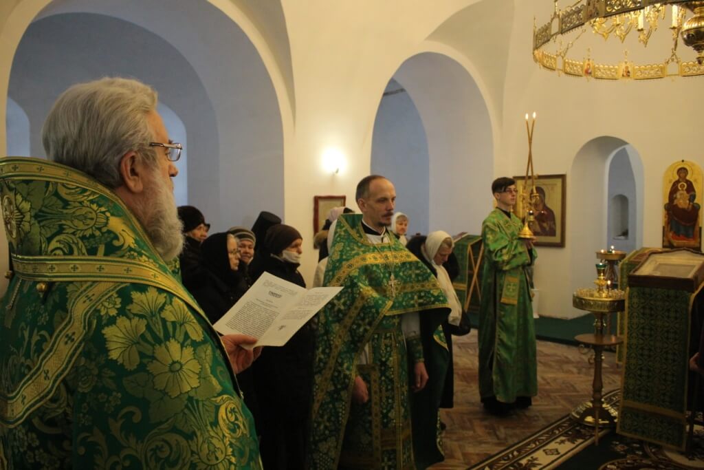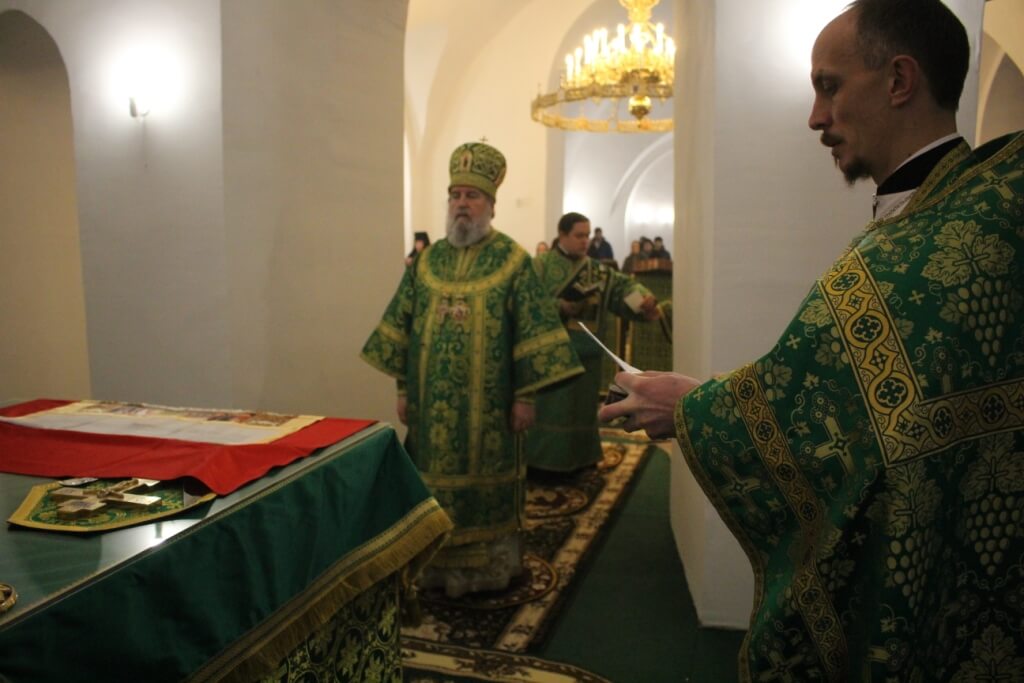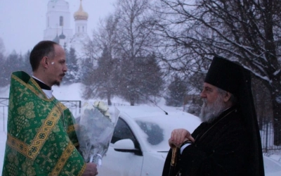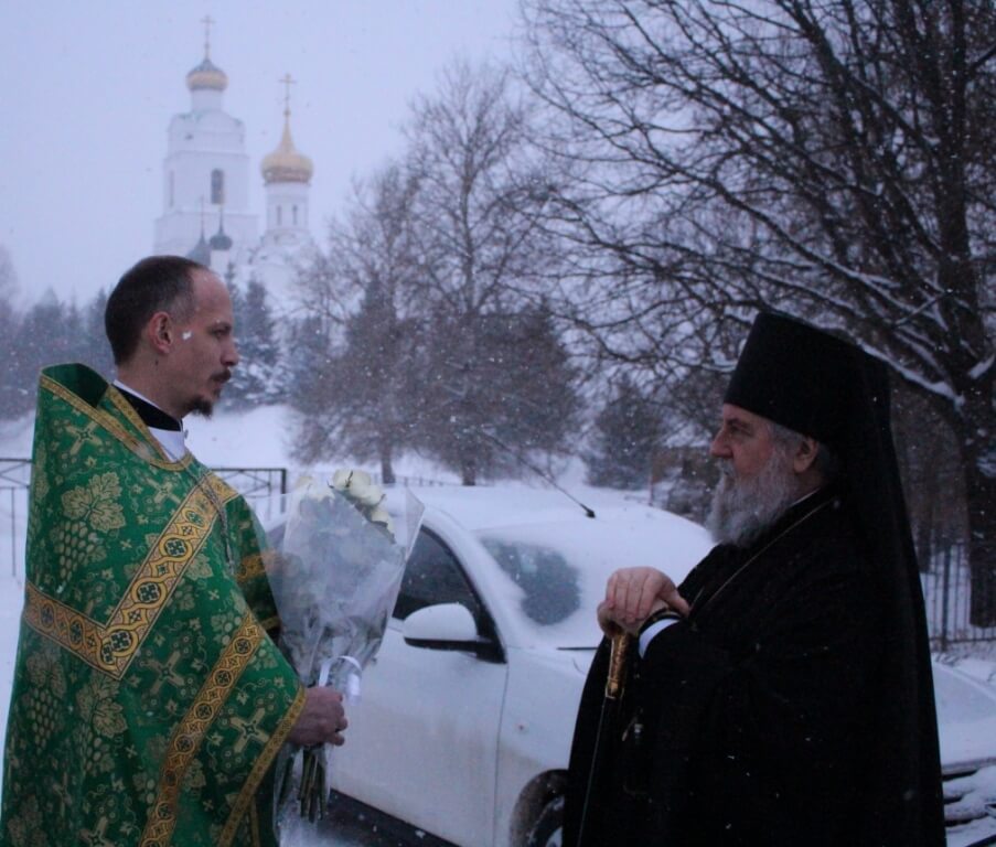 Его Преосвященству сослужили: настоятель прихода преподобного Аркадия иерей Максим Артемьев и настоятель Свято-Троицкого кафедрального собора города Вязьмы иерей Александр Курмелёв.