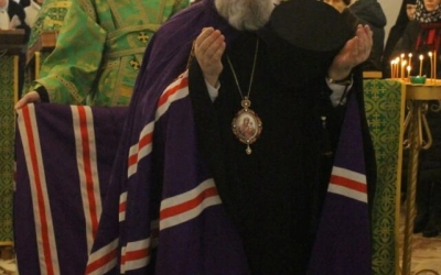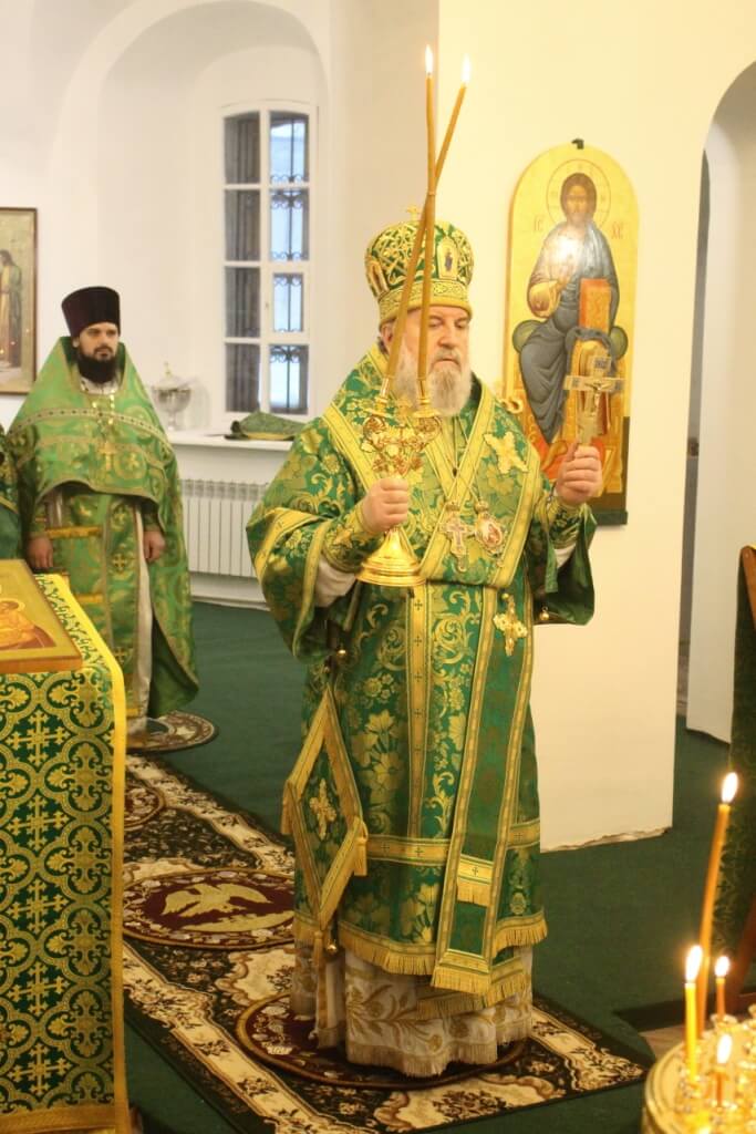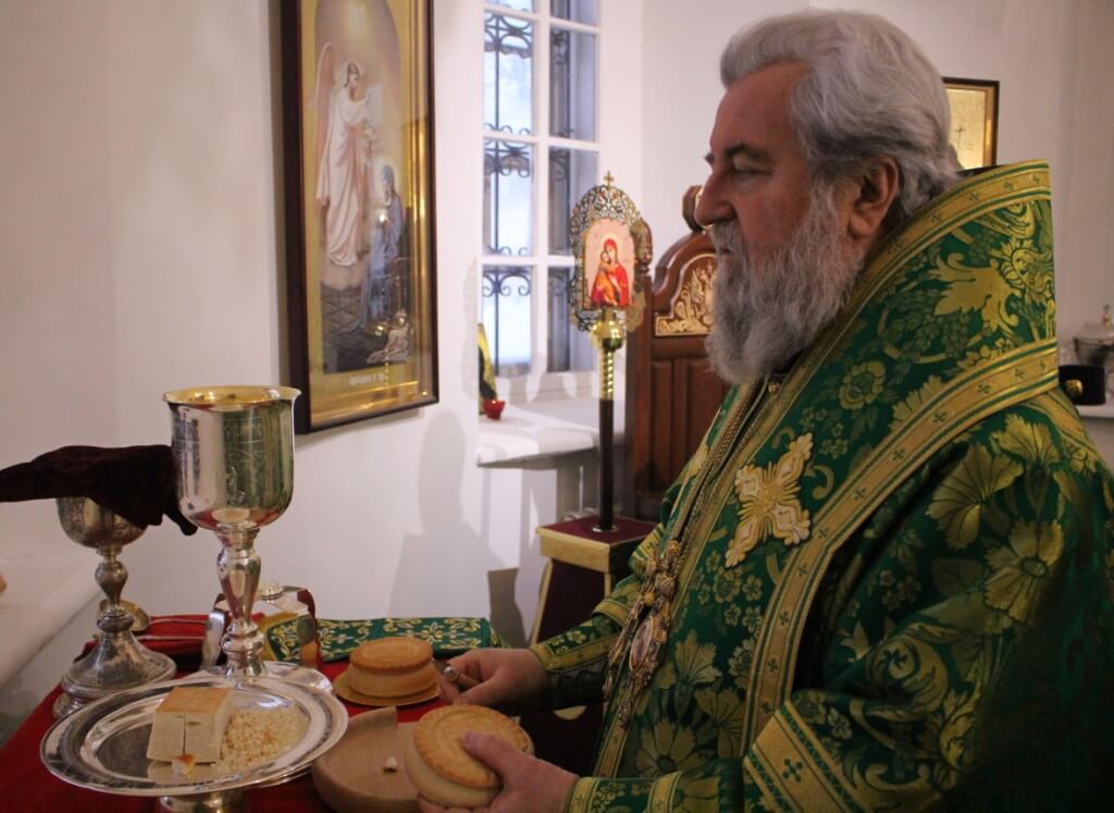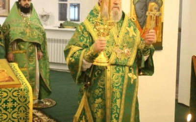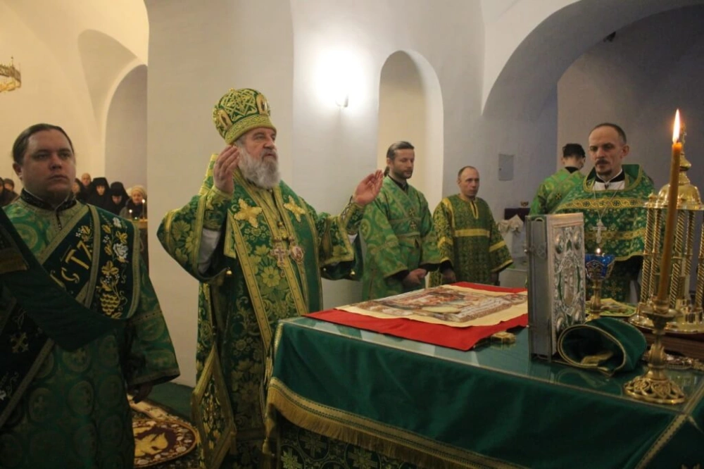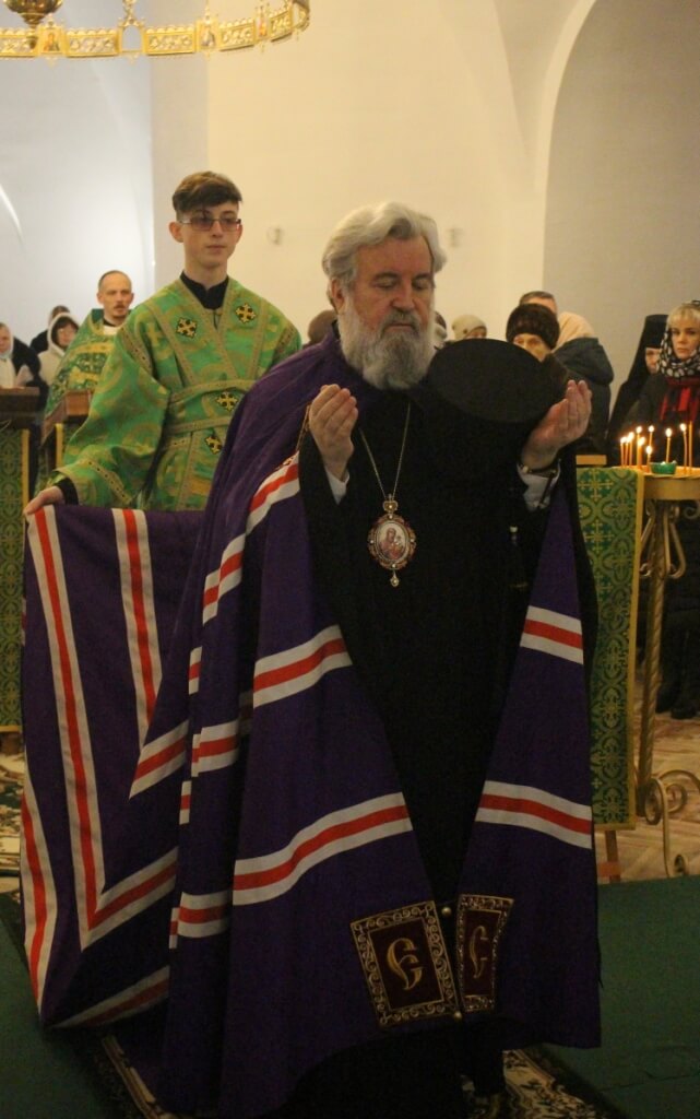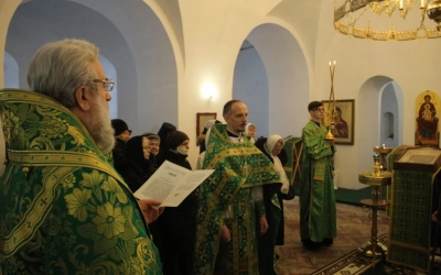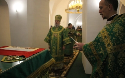 Его Преосвященству сослужили: настоятель прихода преподобного Аркадия иерей Максим Артемьев и настоятель Свято-Троицкого кафедрального собора города Вязьмы иерей Александр Курмелёв.