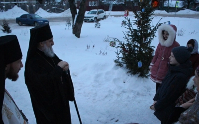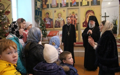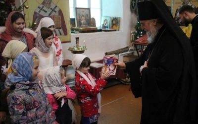 После службы воспитанники воскресной школы под руководством Елены Фатовой выступили с небольшим концертом для Правящего Архиерея, который вручил им сладкие подарки.