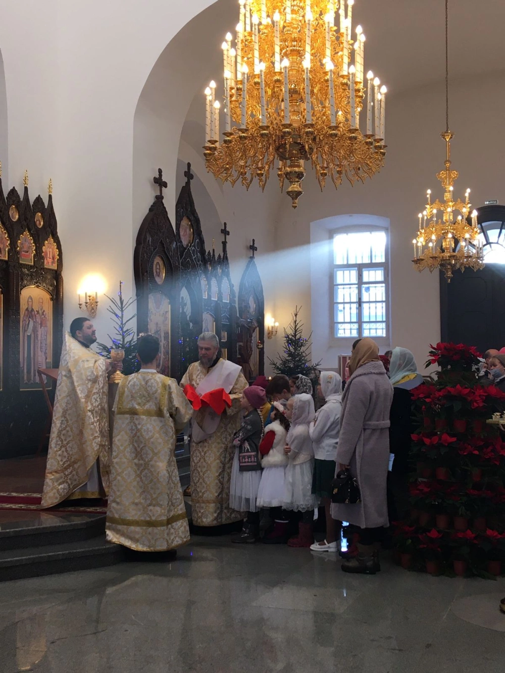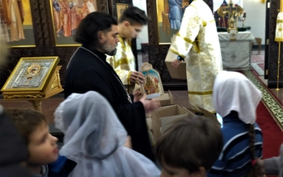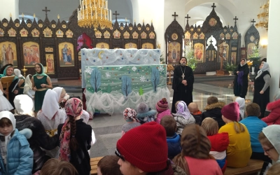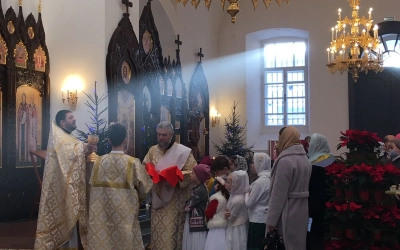 Перед причащением Святых Христовых Таин отец Роман обратился к маленьким прихожанам Благовещенского собора с пастырским словом и поздравлением с Рождеством Христовым. По окончании Богослужения, игумен Александр, настоятель Благовещенского собора вручил всем детям сладкие подарки и пригласил всех присутствующих ребят и их родных к просмотру спектакля, подготовленного детской воскресной приходской группой Благовещенского собора, в основе которого легли реальные события, предшествующие написанию знаменитого Рождественского гимна «Тихая ночь».