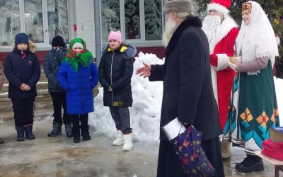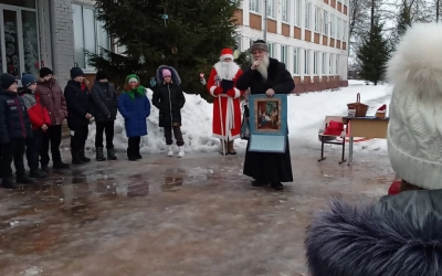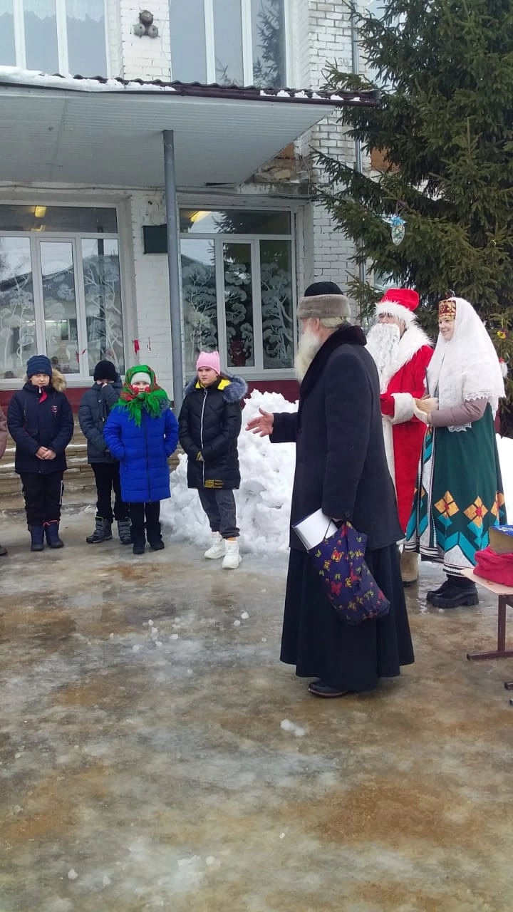 Ведущая Русская Зима и Мороз Иванович предоставили слово настоятелю Свято-Благовещенского храма протоиерею Анатолию Чайкину. С учениками отец Анатолий общался в форме викторины: задавал им вопросы, а дети с удовольствием отвечали. А потом дети задавали вопросы, на которые батюшка отвечал им.
