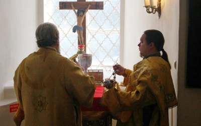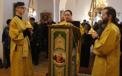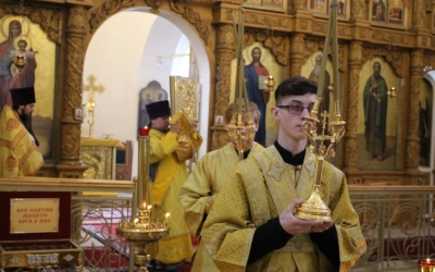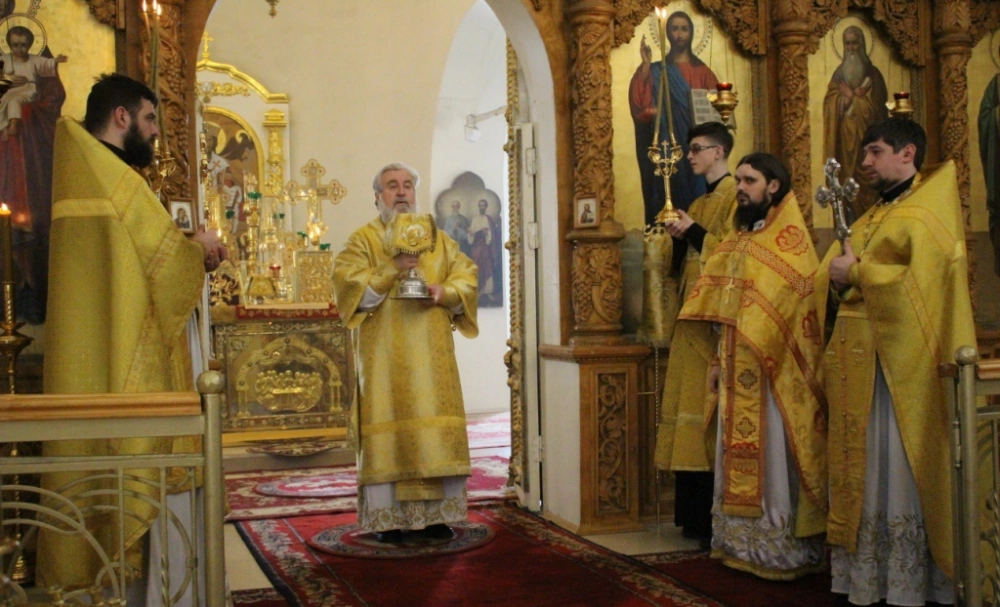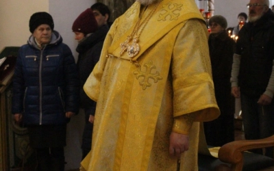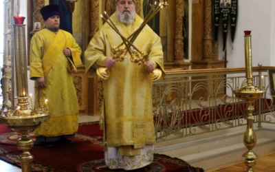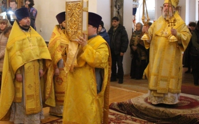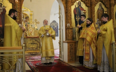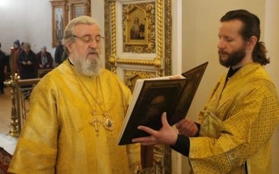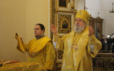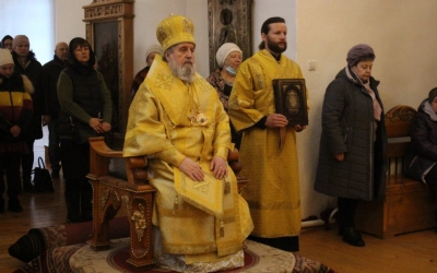 Его преосвященству сослужили: настоятель Свято-Троицкого кафедралього собора иерей Александр Курмелёв и клирики иеромонах Симеон (Берёзкин) и иерей Максим Мамонов.