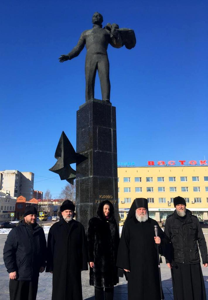 Правящий архиерей совместно с главой администрации МО "Гагаринский район" Хомайка Полиной Викторовной возложили памятную корзину из цветов и цветы к памятнику первого космонавта планеты Земля Юрия Алексеевича Гагарина.