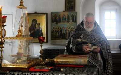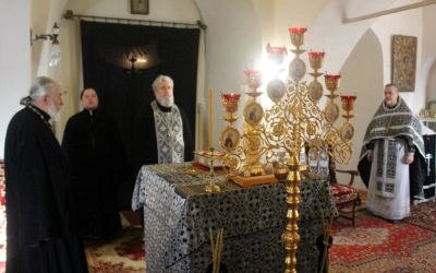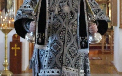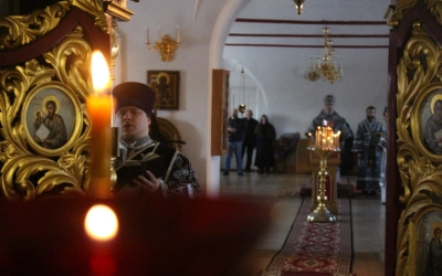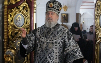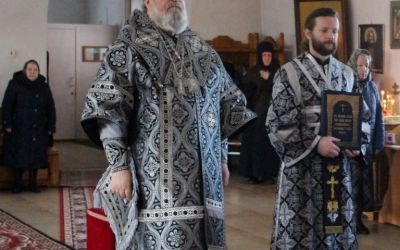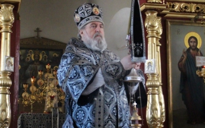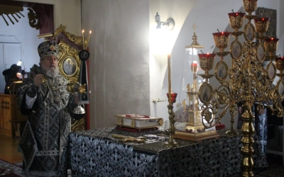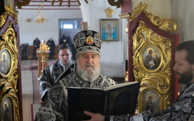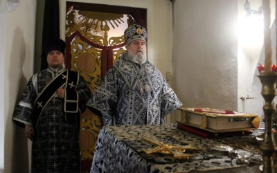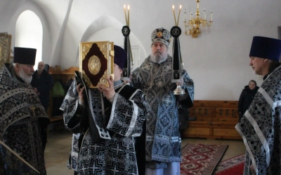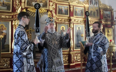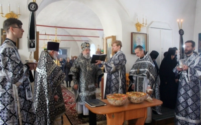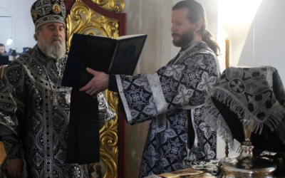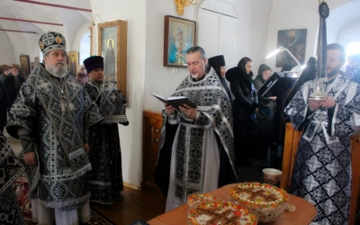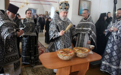 По заамвонной молитве было совершено последование, ежегодно совершаемое в пяток первой великопостной седмицы. После пения тропаря и кондака св. вмч. Феодору Тирону епископ Сергий с духовенством совершили молебный канон великомученику Феодору Тирону.
