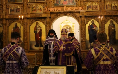 Настоятель Свято-Троицкого кафедрального собора иерей Александр Курмелёв, клирики собора иеромонах Симеон (Берёзкин) и иерей Максим Мамонов.