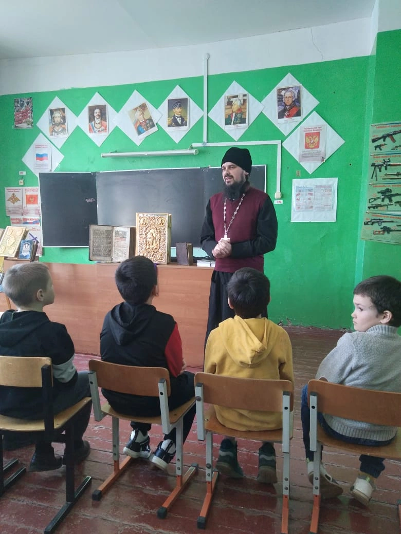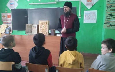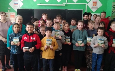 Благочинный Угранского округа иерей Александр Курмелев показал учащимся церковные книги и рассказал о книгопечатании на Руси. Ребята задавали вопросы и даже попробовали почитать на церковно-славянском языке.