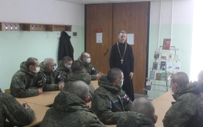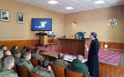 Священник рассказал бойцам об истории книгопечатания на Руси и о важности для человека духовного развития через книгу.
