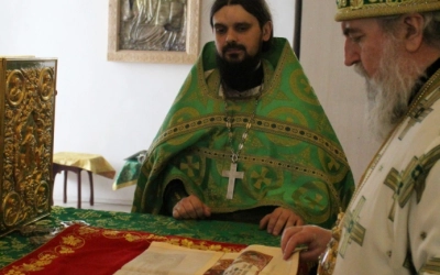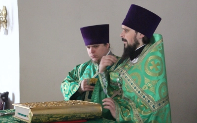 Настоятель Свято-Троицкого собора иерей Александр Курмелёв, клирики собора иеромонах Симеон (Берёзкин) и иерей Максим Мамонов.