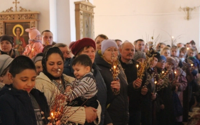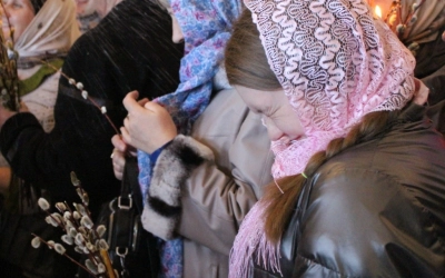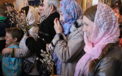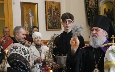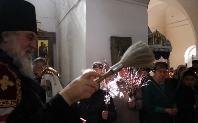 По окончании богослужения владыка обратился к молящимся с архипастырским словом, поздравив всех с праздником, после чего совершил освящение верб.