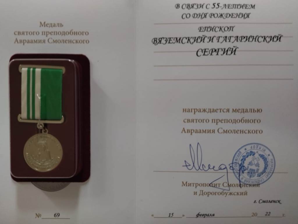 По завершении богослужения высокопреосвященнейший Исидор, митрополит Смоленский и Дорогобужский, обратился ко всем участникам богослужеия, поздравив с праздником Светлого Христова Воскресения и с праздником Иверской иконы Божией Матери, также преосвященнейший Исидор поздравил влаыдку Сергия с прошедшим юбилеем и вручил медаль святого преподобного Авраамия Смоленского за многолетние труды на благо Церкви и в связи с 55-летием.
