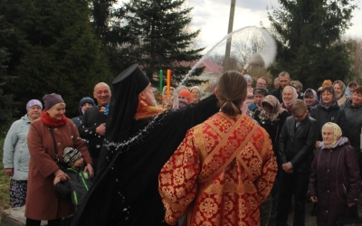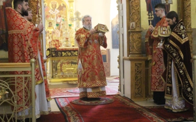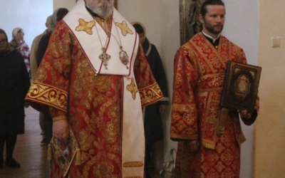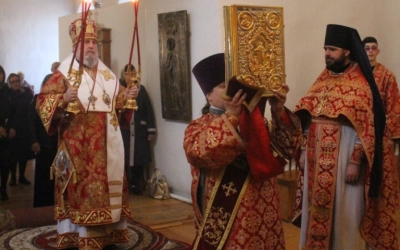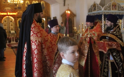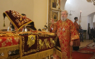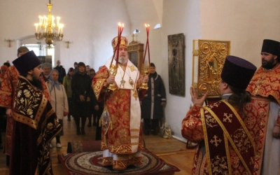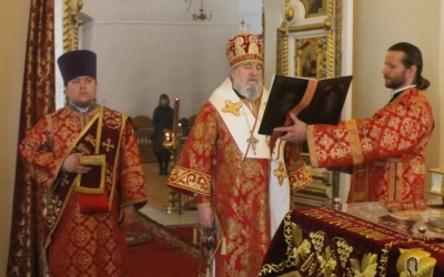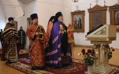 Его Преосвященству сослужили: настоятель Свято-Троицкого кафедрального собора г. Вязьмы иерей Александр Курмелев и клирик собора иеромонах Симеон (Берёзкин).