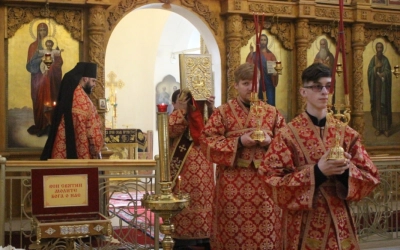 Его Преосвященству сослужили клирики Свято-Троицкого кафедрального собора города Вязьмы иеромонах Симеон (Берёзкин) и иерей Максим Мамонов.